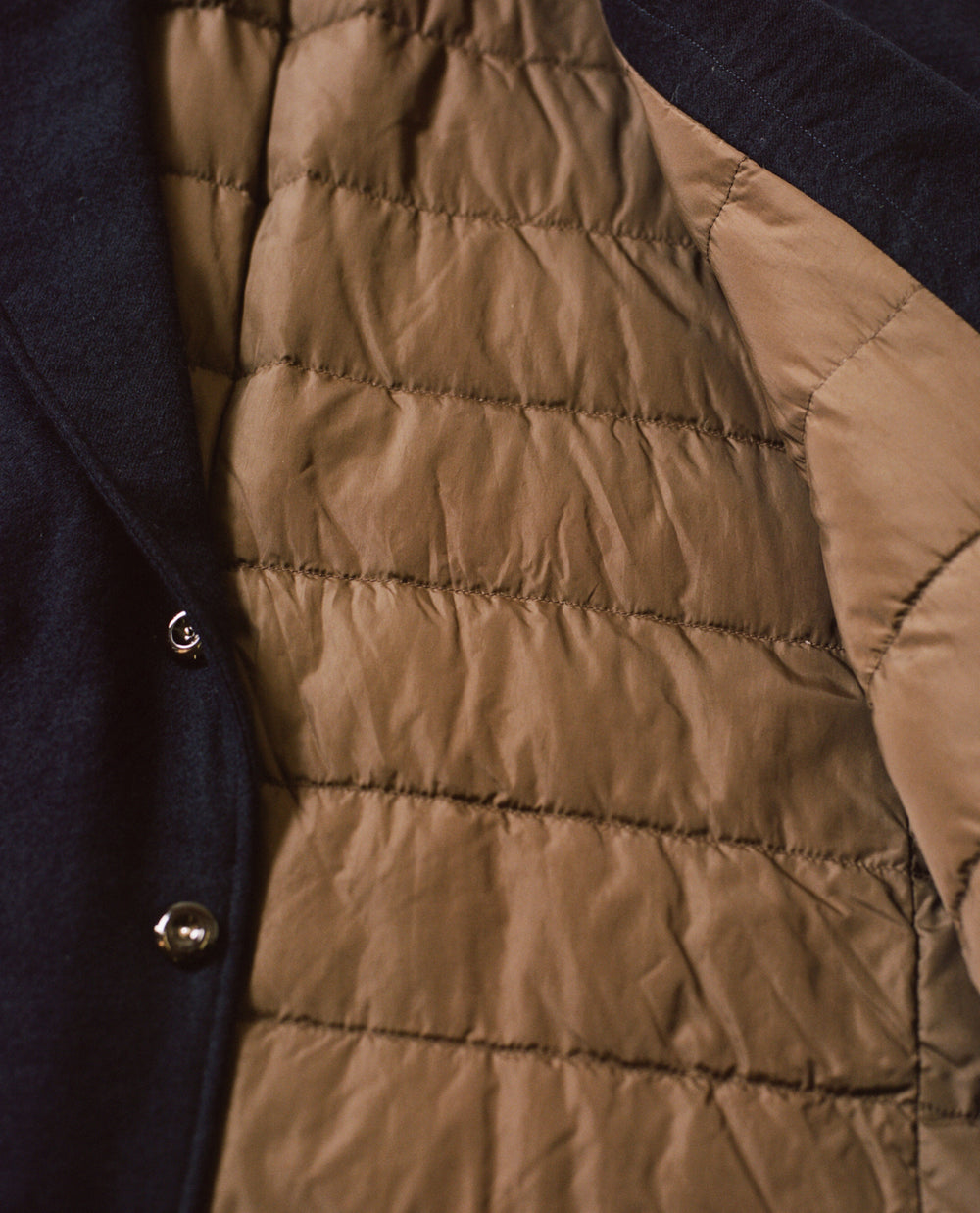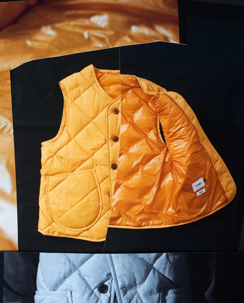 A raglan coat is made in virgin wool herringbone, and paired with a Spanish duck down-filled, quilted taffeta nylon lining, mixing scholarly charm with technical expertise; while a quilted vest is effortlessly wearable, made from soft, durable Japanese cotton, with a recycled nylon lining, it delivers exceptional warmth without bulk.