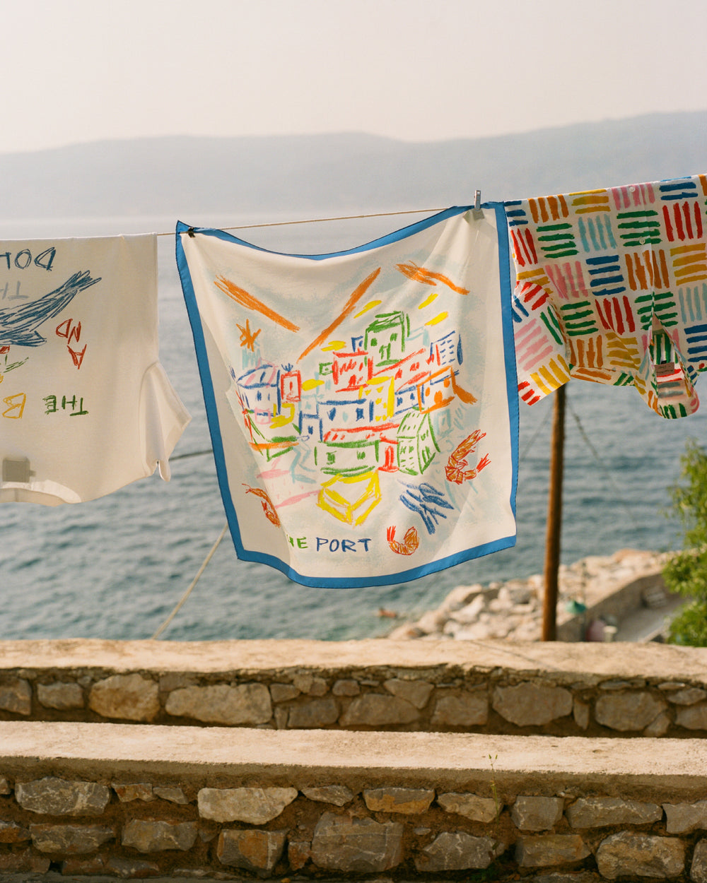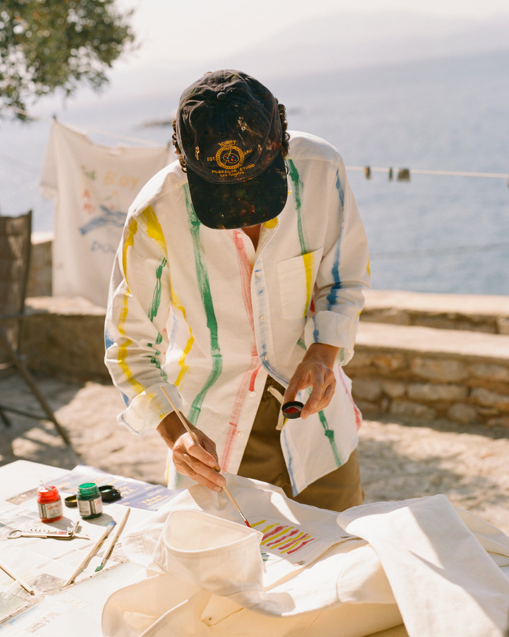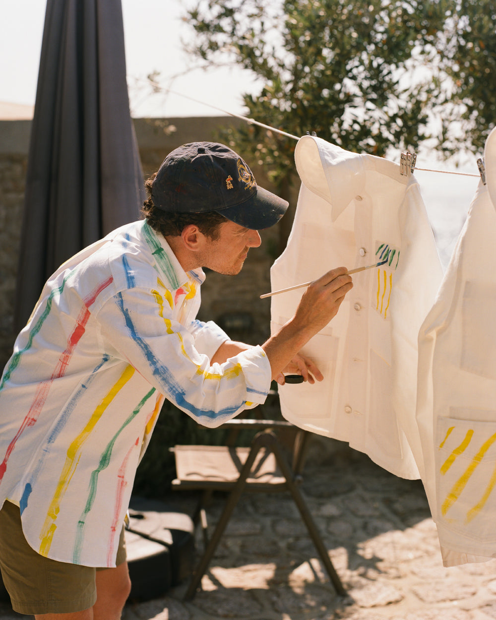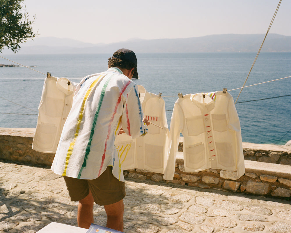 A collaboration years in the making, we’ve partnered with Michael on a limited edition collection inspired by his work on Hydra. There are short-sleeve and Oxford shirts in crisp cotton with an unmistakably colourful McGregor stripe throughout, t-shirts that reference local landmarks, loose drawstring shorts for hot days down by the port, along with embroidered caps featuring his take on the Hydra flag, and a very small run of custom-painted chore jackets, finished overlooking the sea on a summer’s day.
