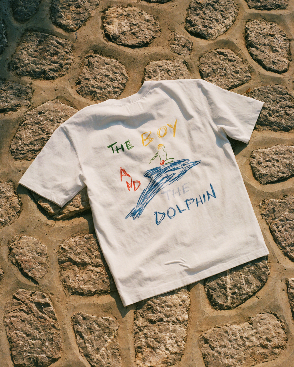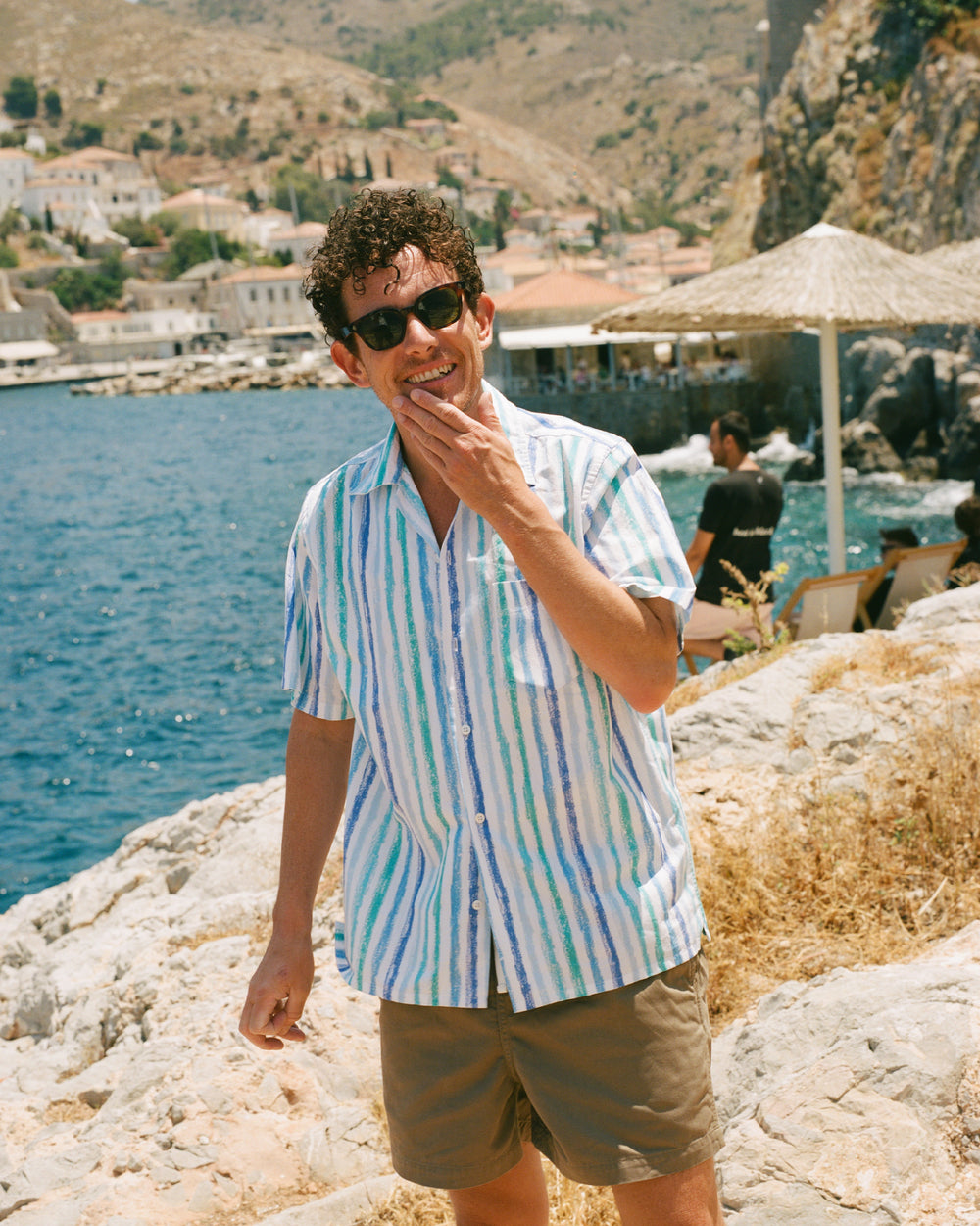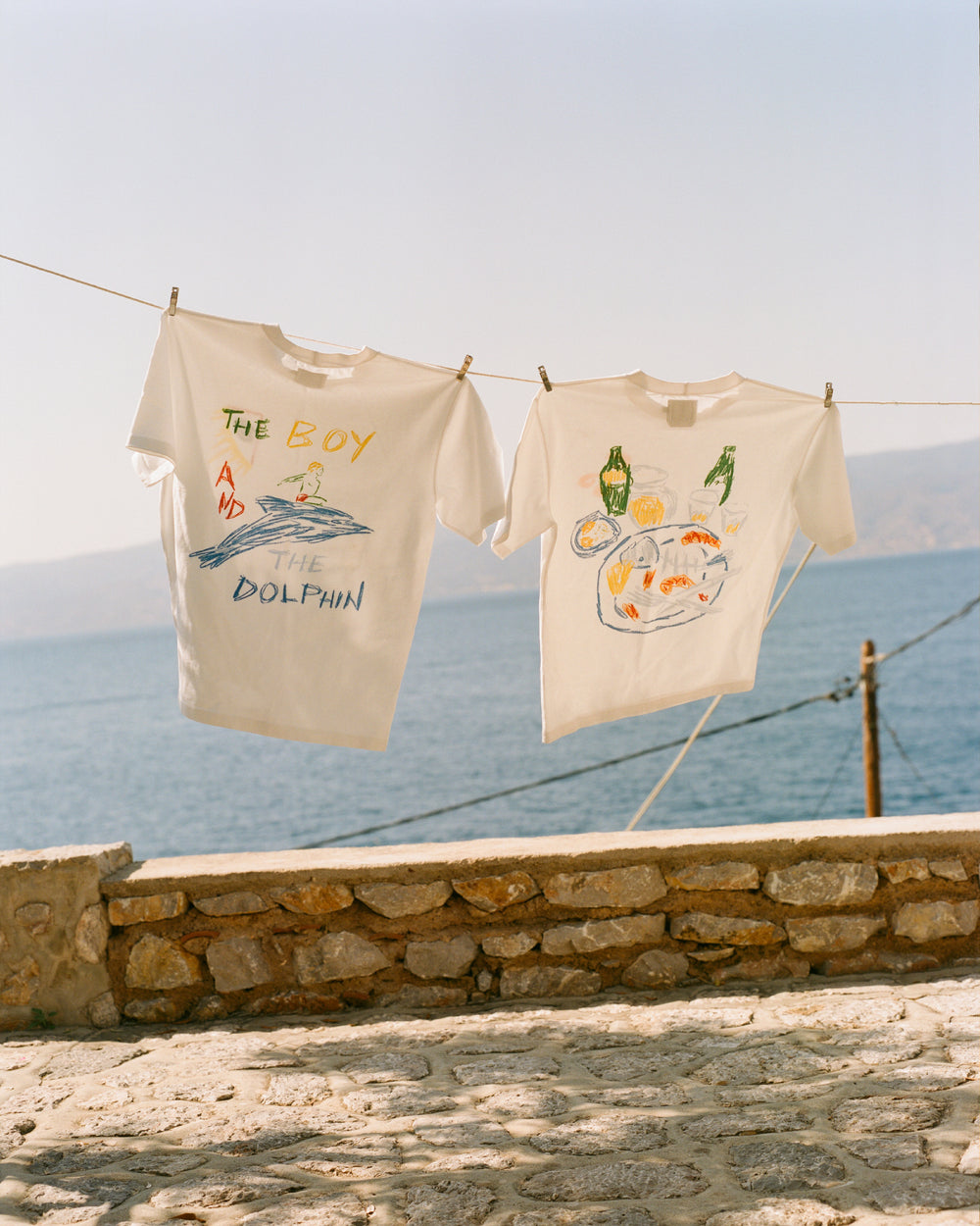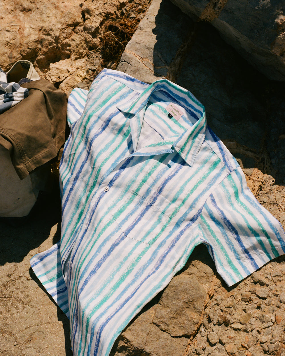 A collaboration years in the making, we’ve partnered with Michael on a limited edition collection inspired by his work on Hydra. There are short-sleeve and Oxford shirts in crisp cotton with an unmistakably colourful McGregor stripe throughout, t-shirts that reference local landmarks, loose drawstring shorts for hot days down by the port, along with embroidered caps featuring his take on the Hydra flag, and a very small run of custom-painted chore jackets, finished overlooking the sea on a summer’s day.