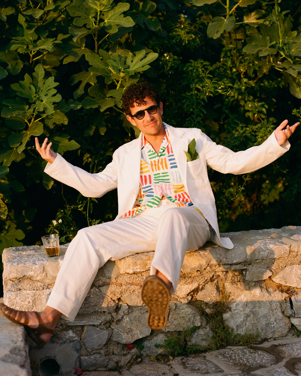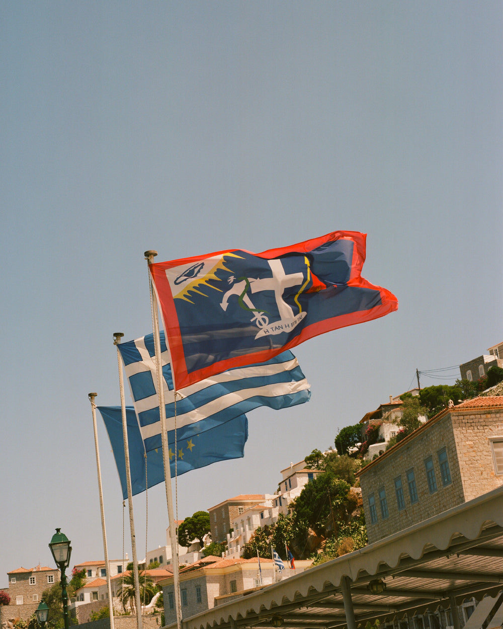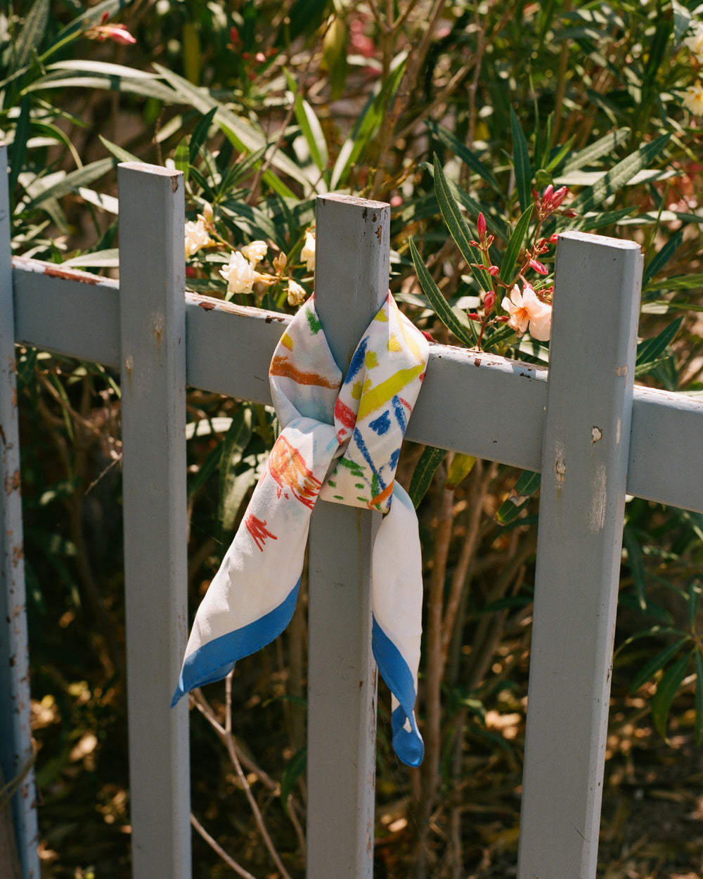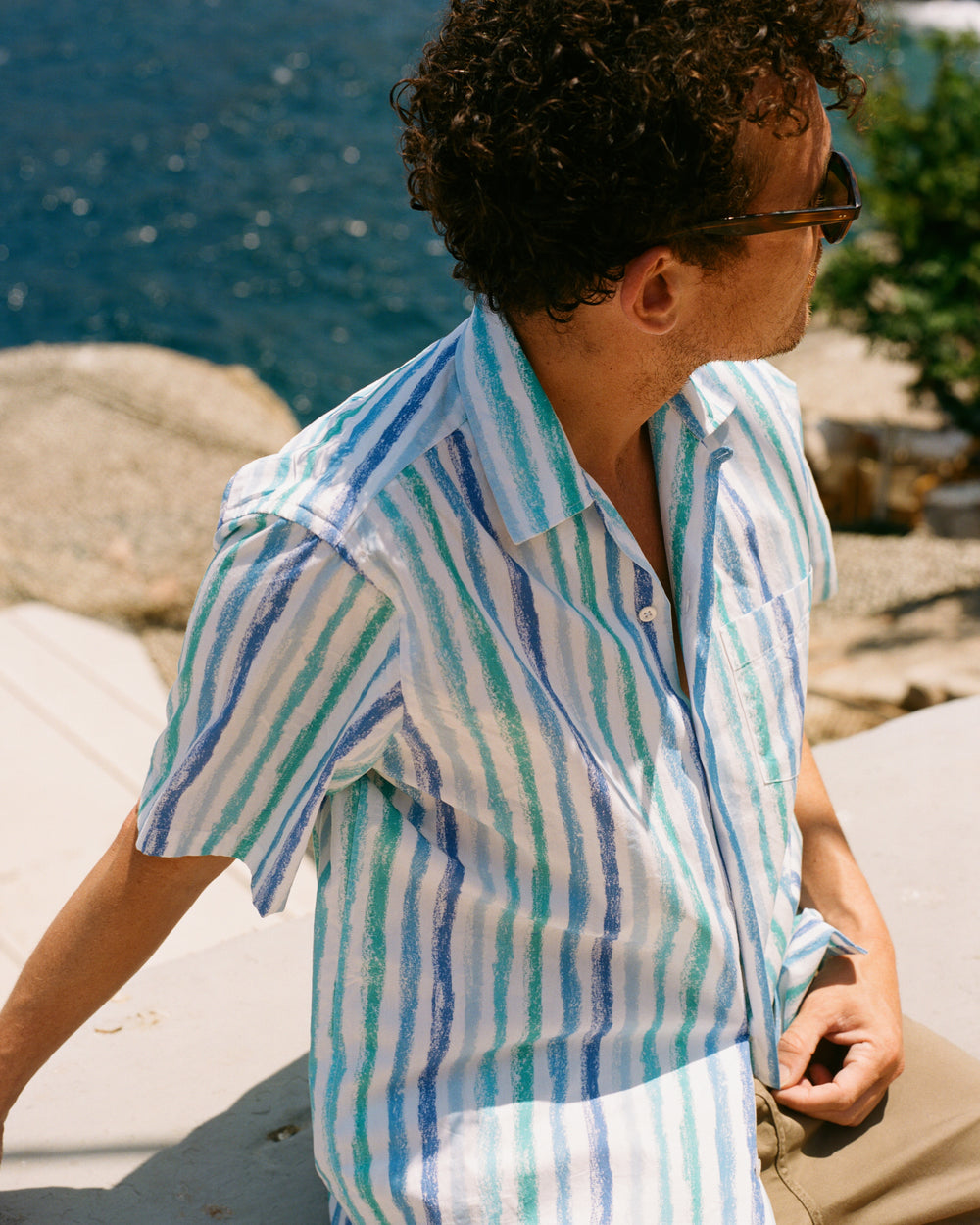 A collaboration years in the making, we’ve partnered with Michael on a limited edition collection inspired by his work on Hydra. There are short-sleeve and Oxford shirts in crisp cotton with an unmistakably colourful McGregor stripe throughout, t-shirts that reference local landmarks, loose drawstring shorts for hot days down by the port, along with embroidered caps featuring his take on the Hydra flag, and a very small run of custom-painted chore jackets, finished overlooking the sea on a summer’s day.