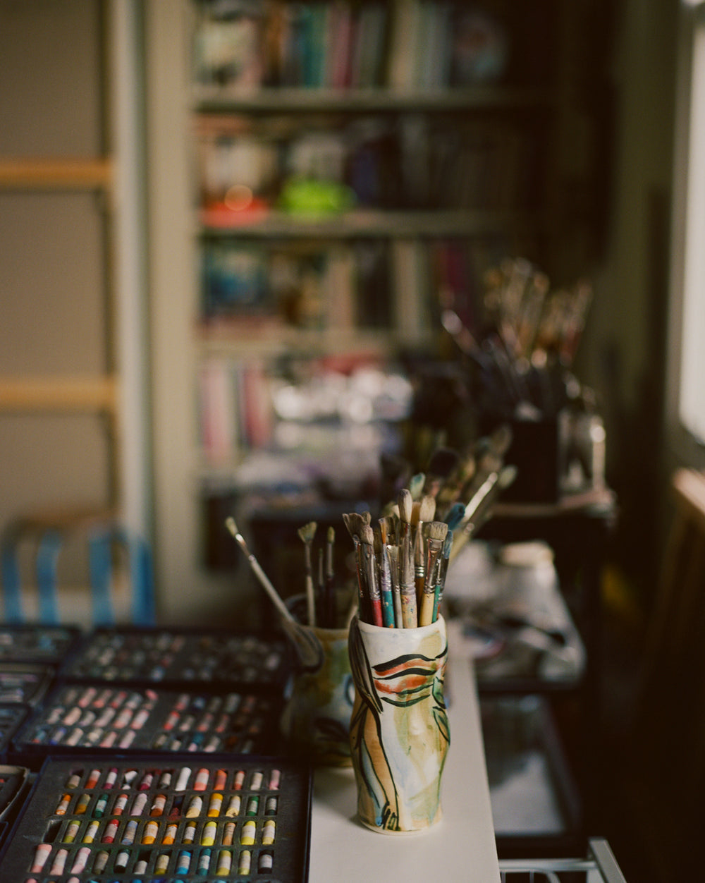 Cooper’s studio is a large room on the raised ground floor of her home, a Victorian townhouse that she has lived in since 1984. Here, she has set up an unfussy mise en scène: I sit on a camping chair in front of a large canvas that leans with its face to the wall. To my left is a blue-legged stool, on it a glass jug containing a bouquet of autumnal flowers with a single incongruous pink rose. When she’d asked me if I wanted to be pictured holding something, I had bristled, not wanting to force some symbolic statement. I’m satisfied to realise, as I sit down ready to take notes with my notebook and a gold-nibbed pen that I’m admittedly very proud of, that the decision had been made for me.