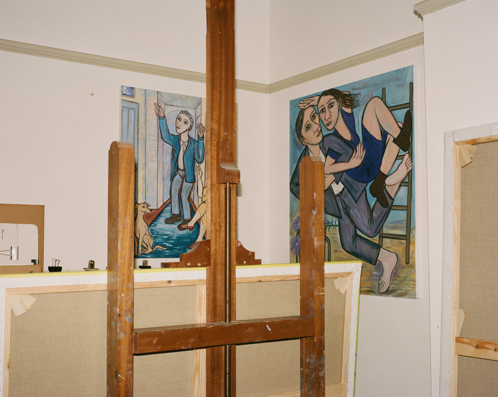 Cooper describes her earliest work as dark, psychological, sexual: “The painting of a younger woman.” Recently, an exhibition in London displayed a group of her drawings from the 1970s and 80s containing severe bodies contorted into violent tangles, invariably naked. In time, the work has softened: her characters’ expressions have become kinder and their gestures gentler. They float peacefully, clothed, rarely colliding as those in the early work do. Female bodies are still the primary subject of her non-portrait work, and they still appear folded into unlikely shapes (she never has trouble fitting someone’s full figure into these images, as she does with the portraits).