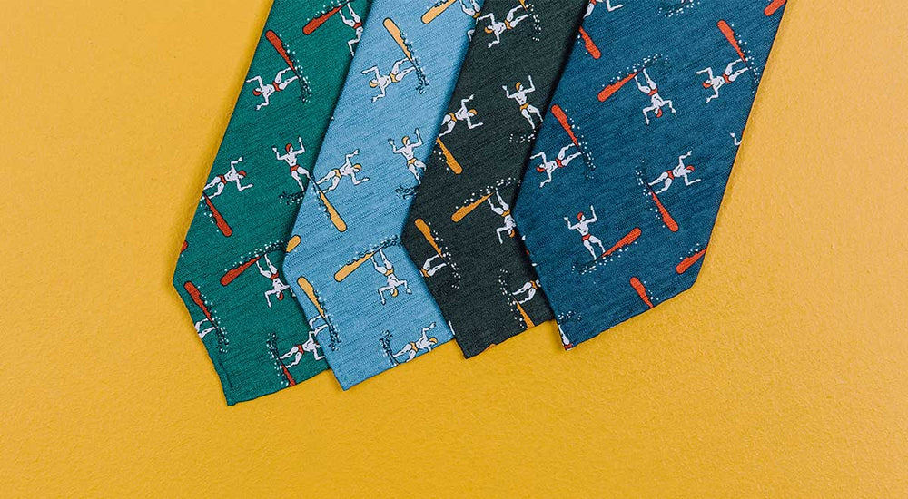 As with the art deco prints we discussed before, when it comes to styling these, pay attention to the secondary colours in each tie. The navy surfer is riding a crimson surf board, so pick the colour out in your other accessories. Do the same in the yellow that appears elsewhere, or build out a tonal look with other elements in olive or tobacco. You could even use the navy sailor print tie to work touches of warm orange or red through an otherwise sober business look.