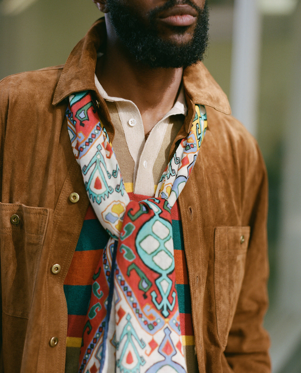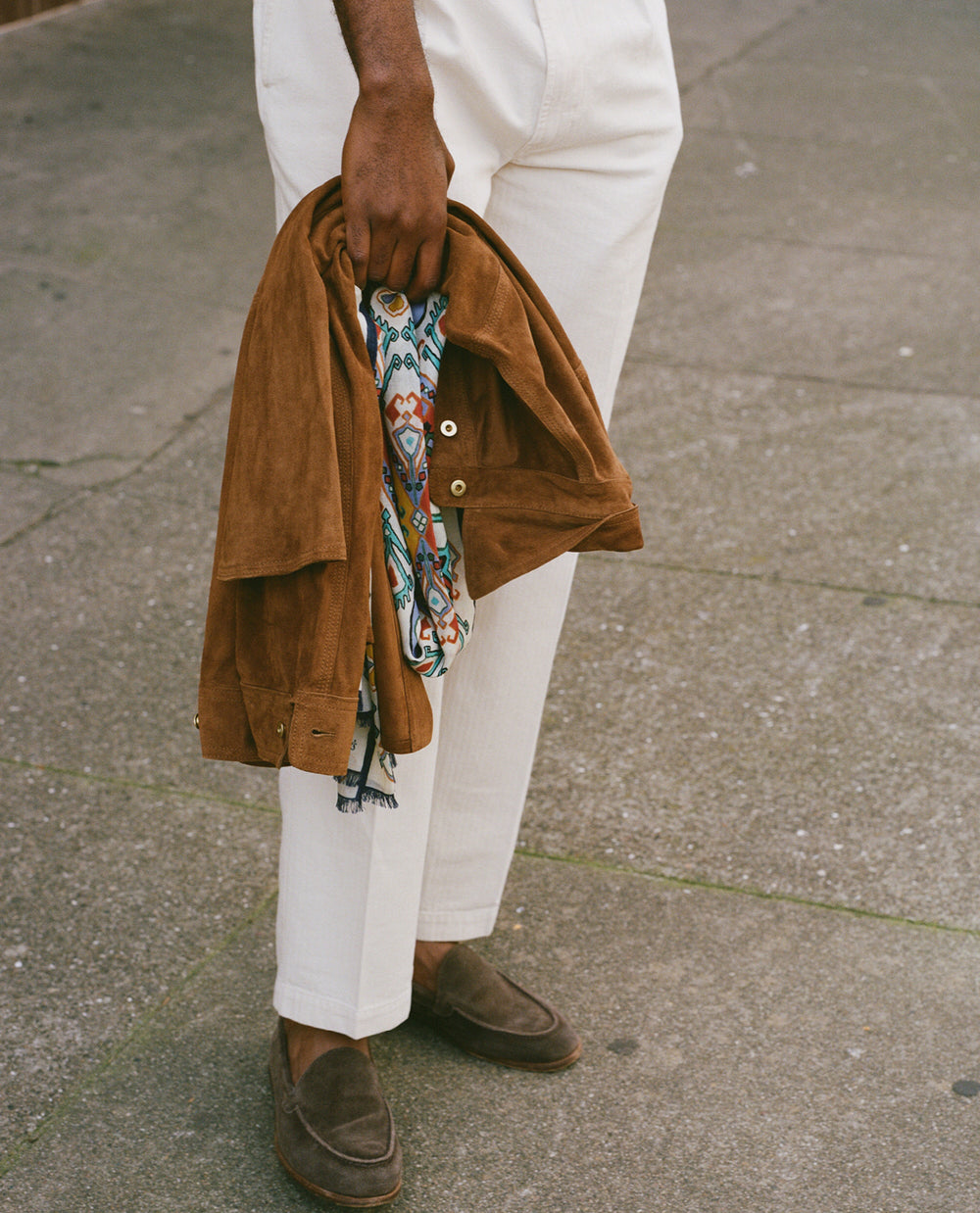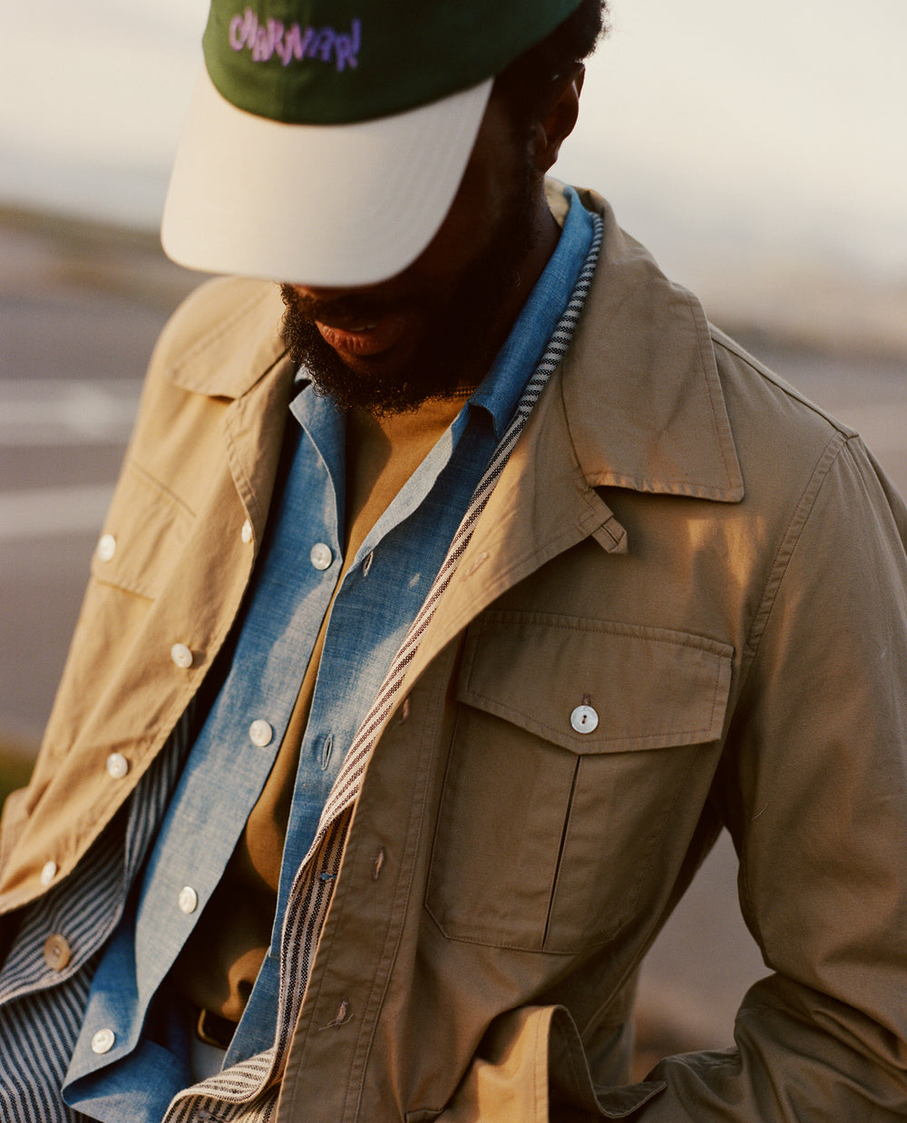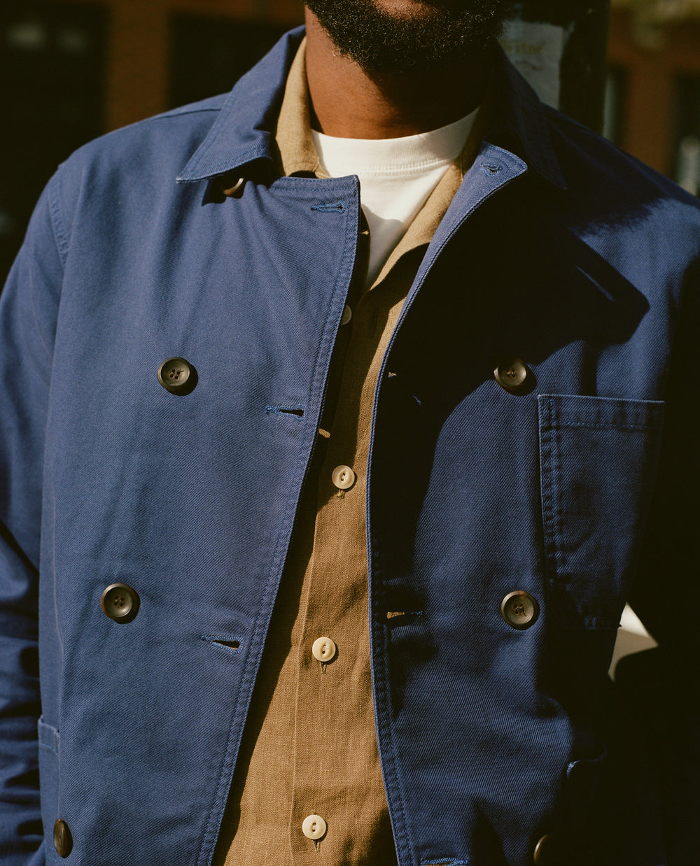 A Striped Raglan Chore, constructed from an indigo-stripe denim, woven and dyed in Japan, and a Gabardine Barn Jacket, will be faithful companions in both town and country, and draw on the legacy of American workwear that built the city. While a Double Breasted Chore in French blue nods to the city’s artistic history.