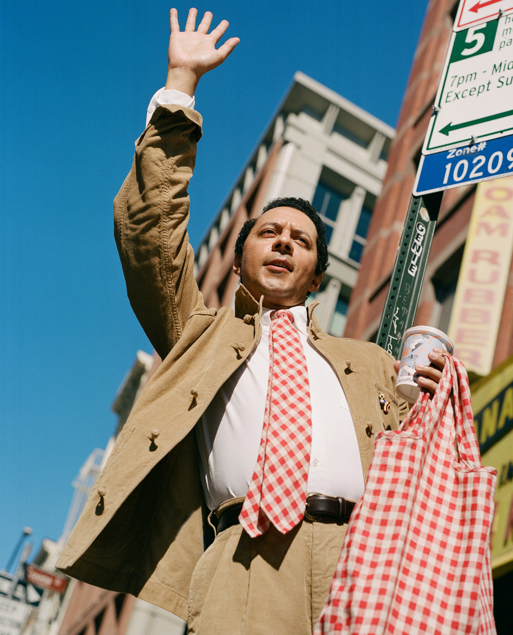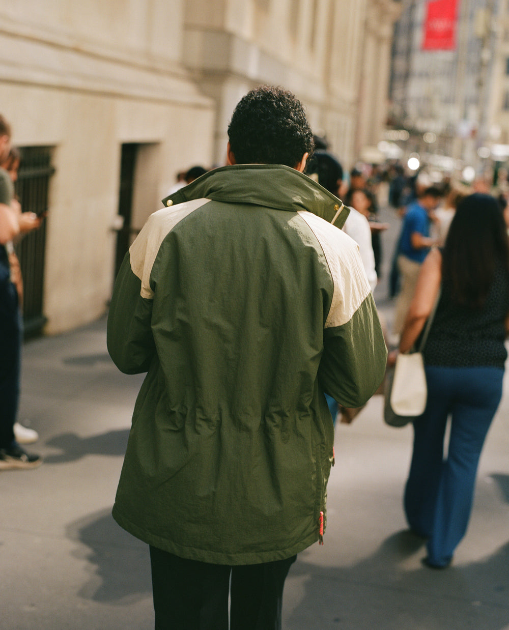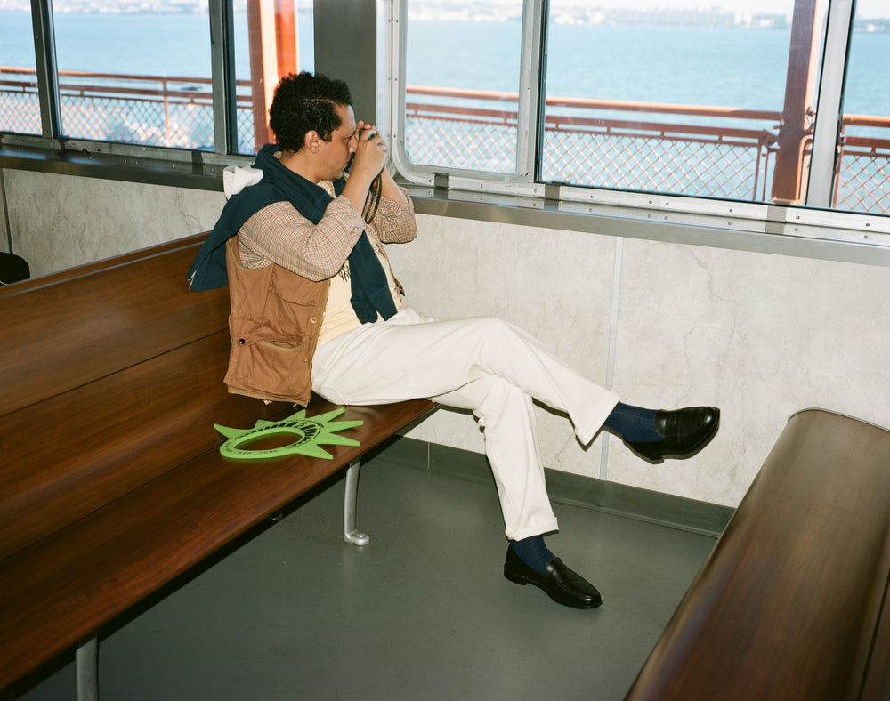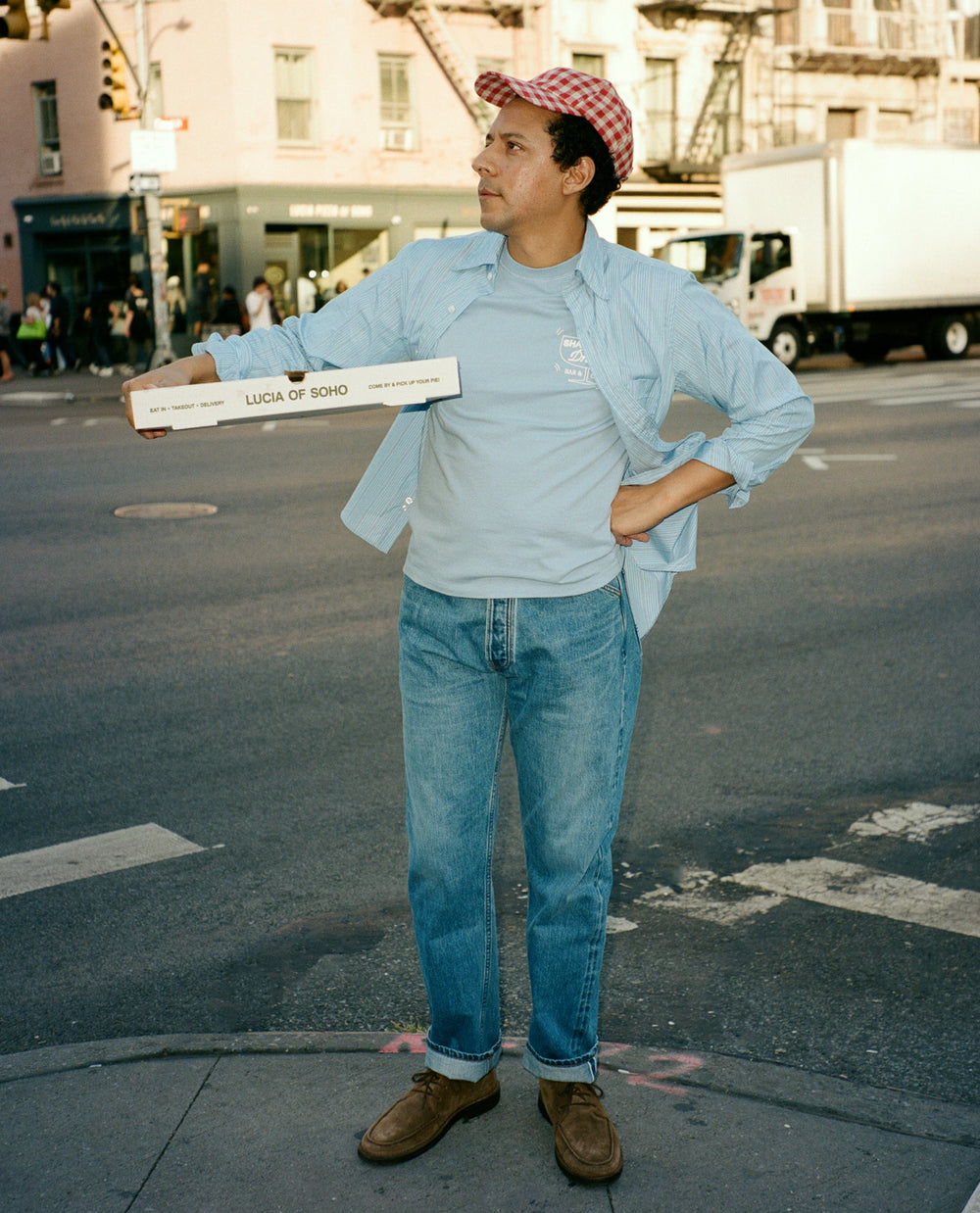 It’s this culinary and cultural energy and history that’s inspired this collection. From the gingham table cloths of old school red sauce restaurants to huge diner burgers and the smooth luxury of martinis and oysters. A smock jacket in cord celebrates Tribeca’s artistic heritage, while the white collar and cuffs of red-striped western shirt are ready for a day analysing the markets and making deals, especially when paired with a double breasted fresco suit made in our factory in Veneto. Elsewhere, an olive and ecru windbreaker and a safari vest perfectly prepare for whatever the city throws at you.