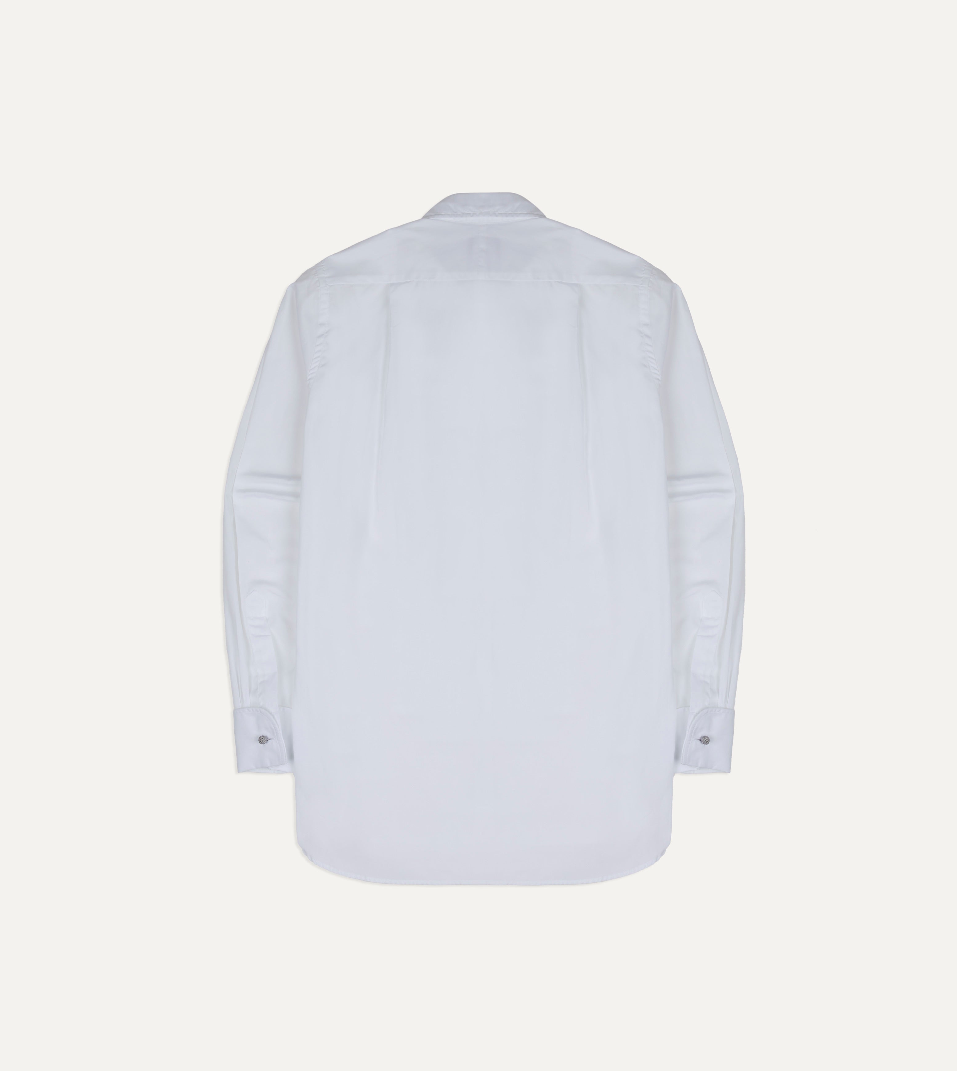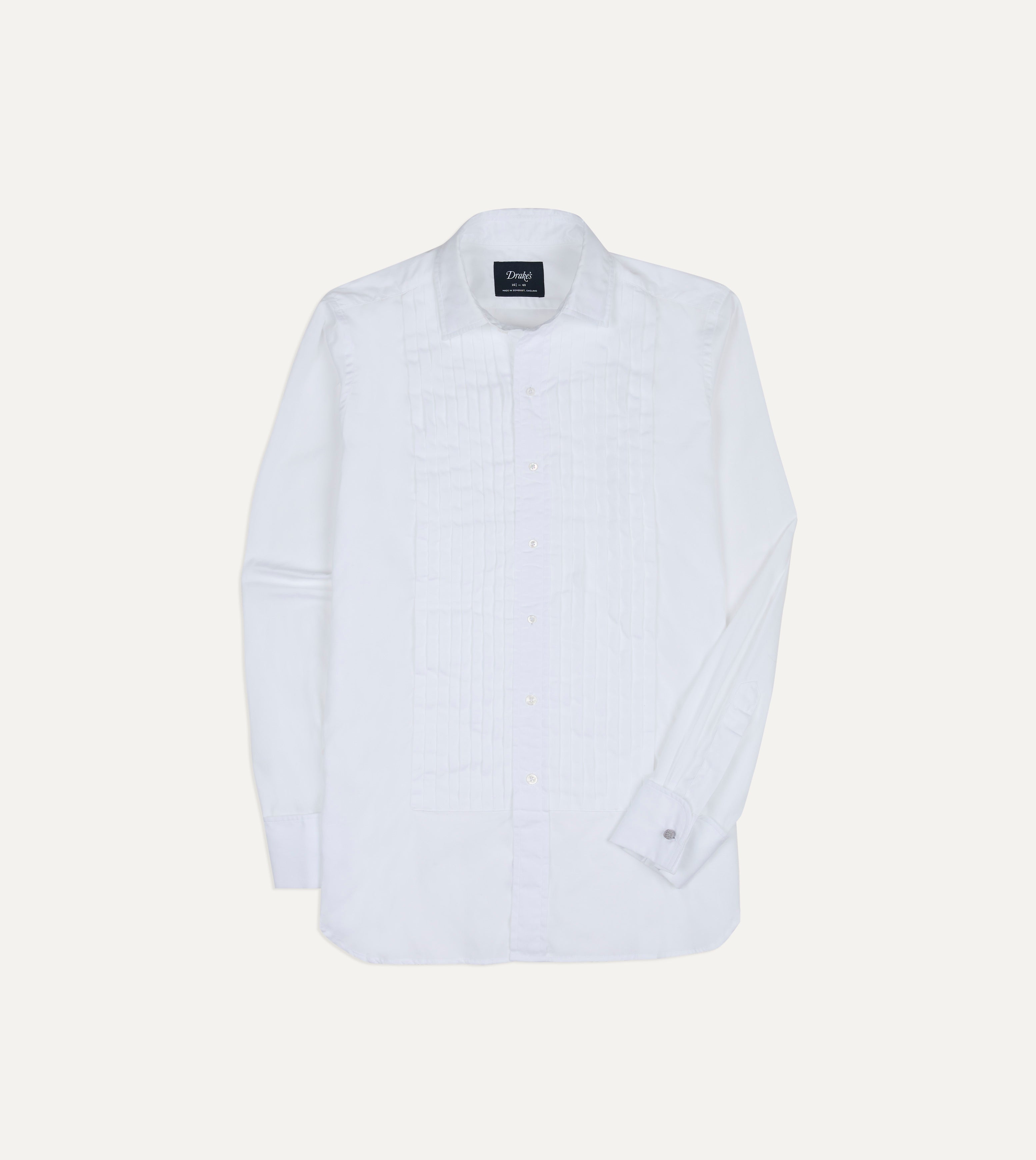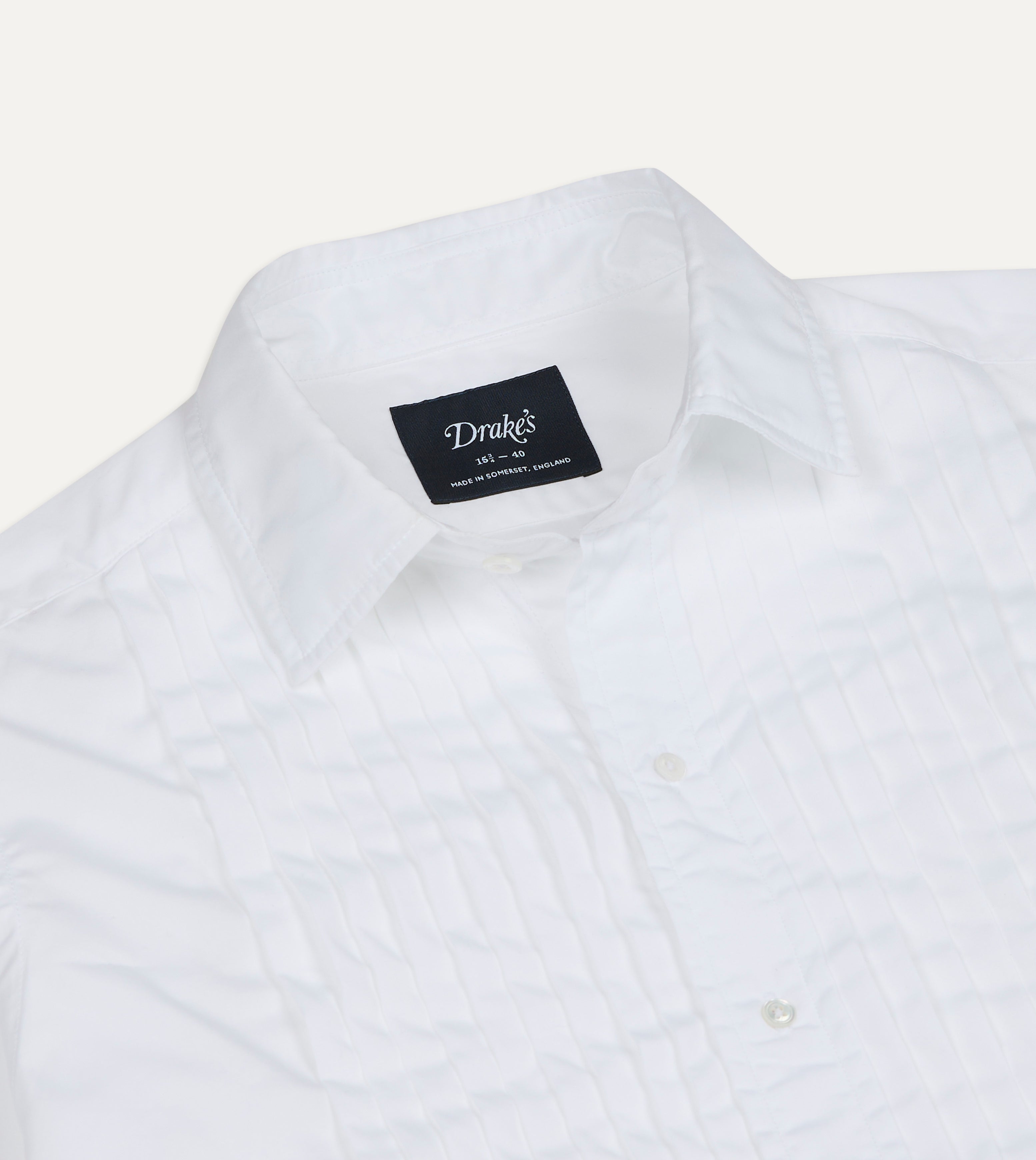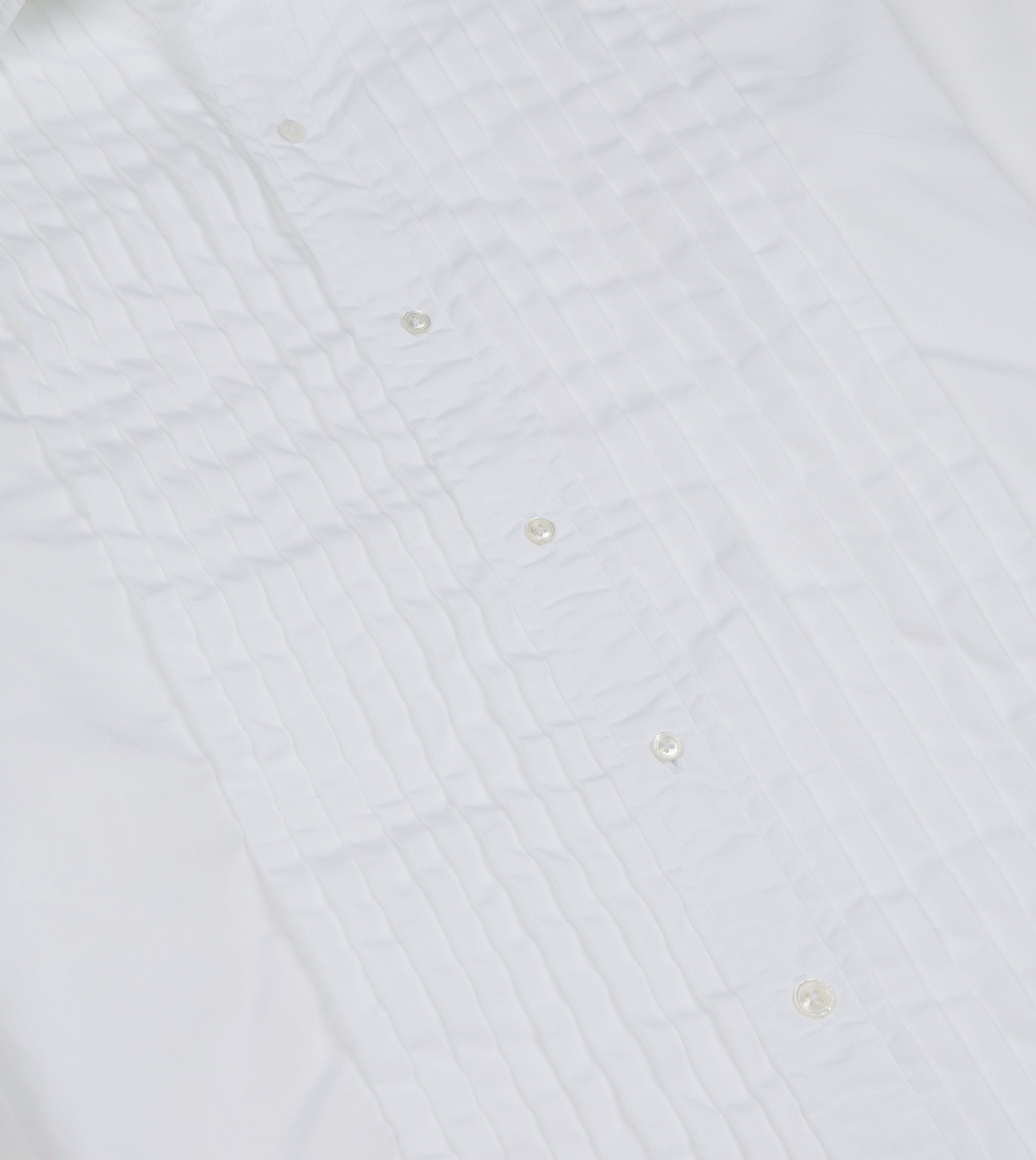 With a pleated placket and French cuffs, this dinner shirt features the same single-needle construction as per our British-made shirting, and is ideal for pairing with our dinner suit.