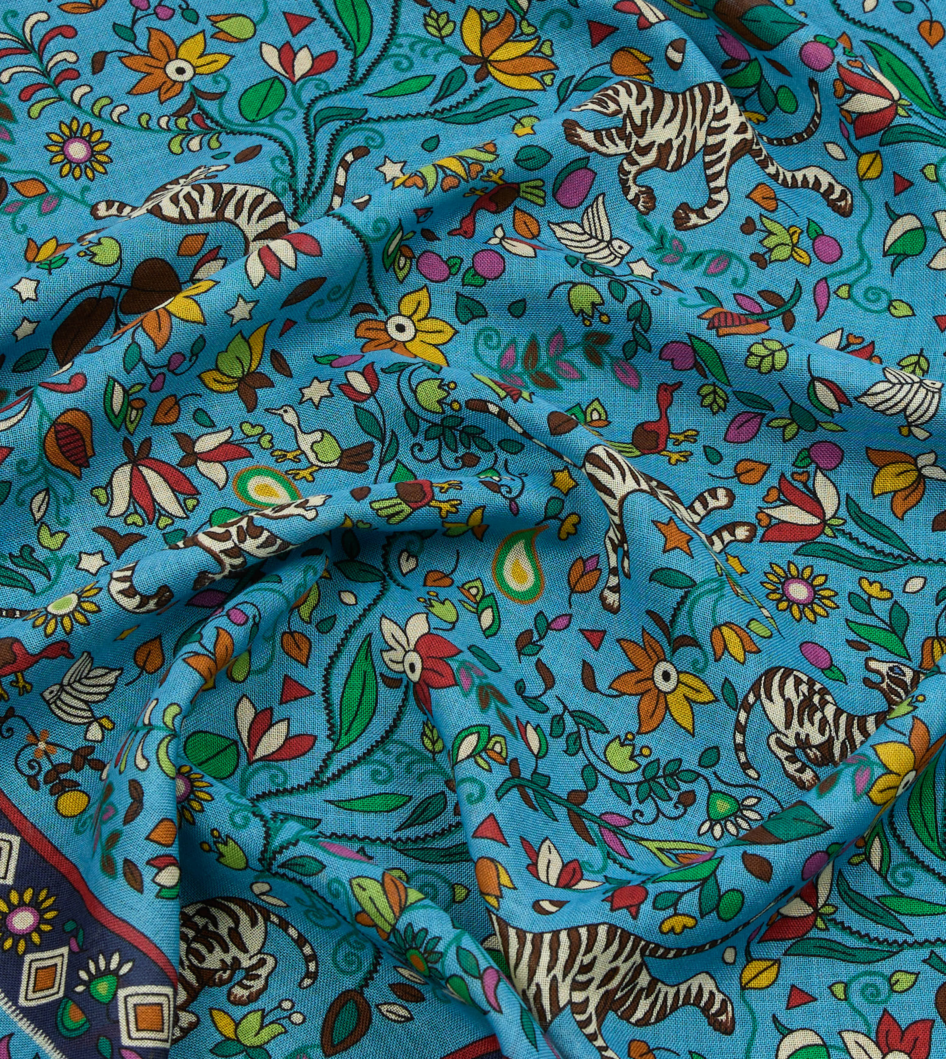 Taken from our extensive design archive, this tiger garden motif has been vividly applied to a blend of pure wool and silk for an elegant and airy addition to your arsenal.