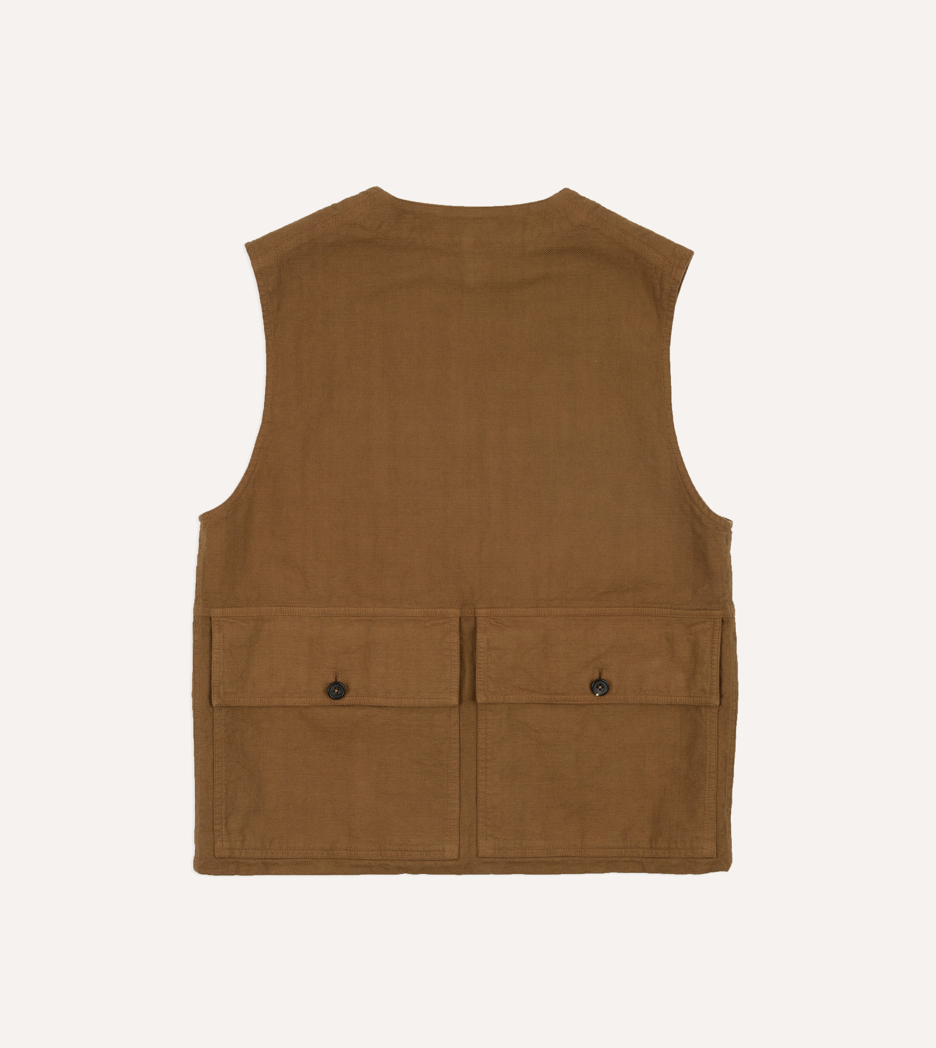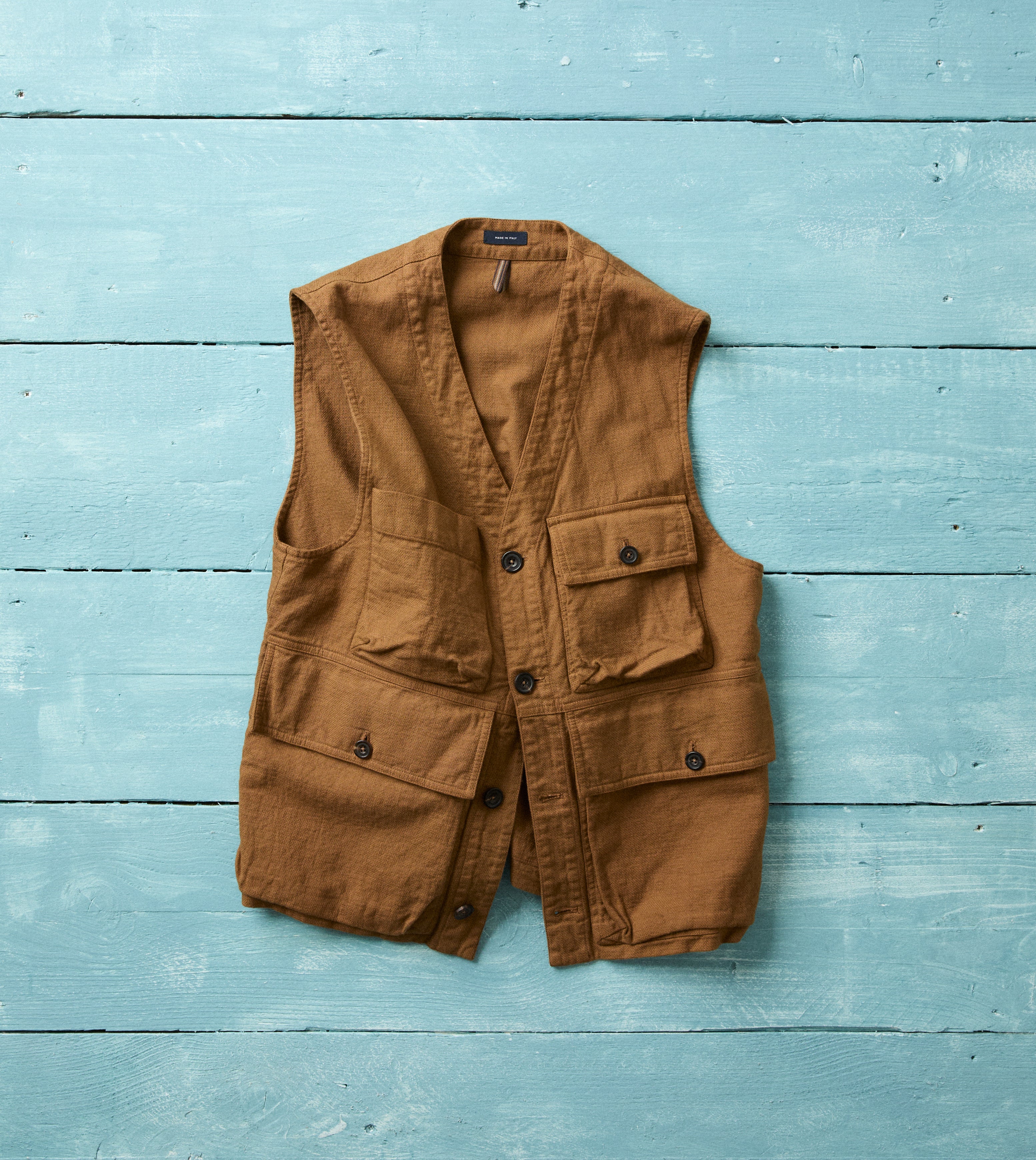 We’ve long admired the practicality and charm of traditional utility vests; garments designed with real intention. This piece is inspired by vintage outdoor hiking gear unearthed in our research archives, and is cut from a 10.2oz rustic weave cotton, woven in Italy, with a dry, tactile handle and enough substance to lend structure without sacrificing ease of wear.