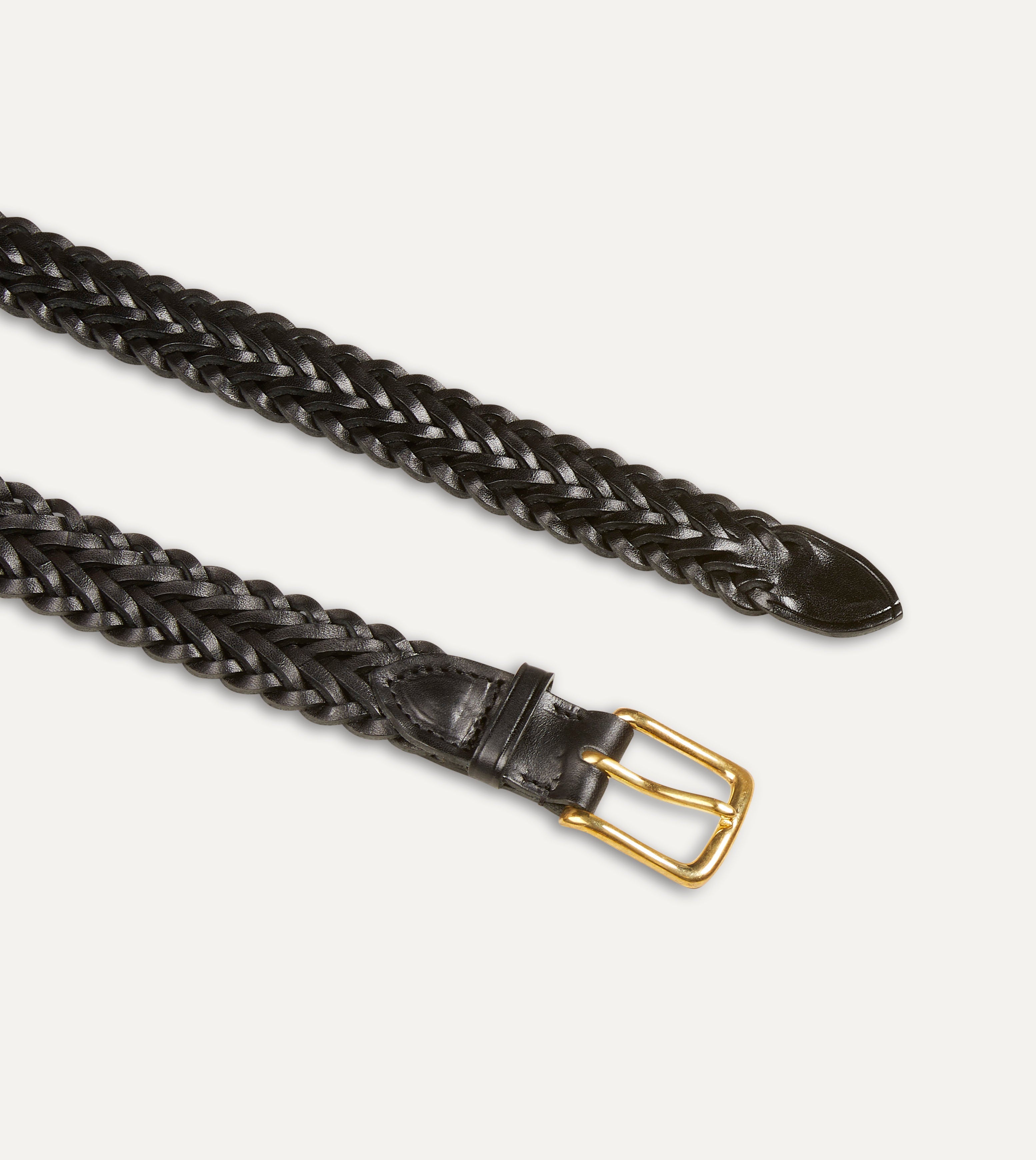 Black Plaited Bridle Leather Belt with Brass Buckle