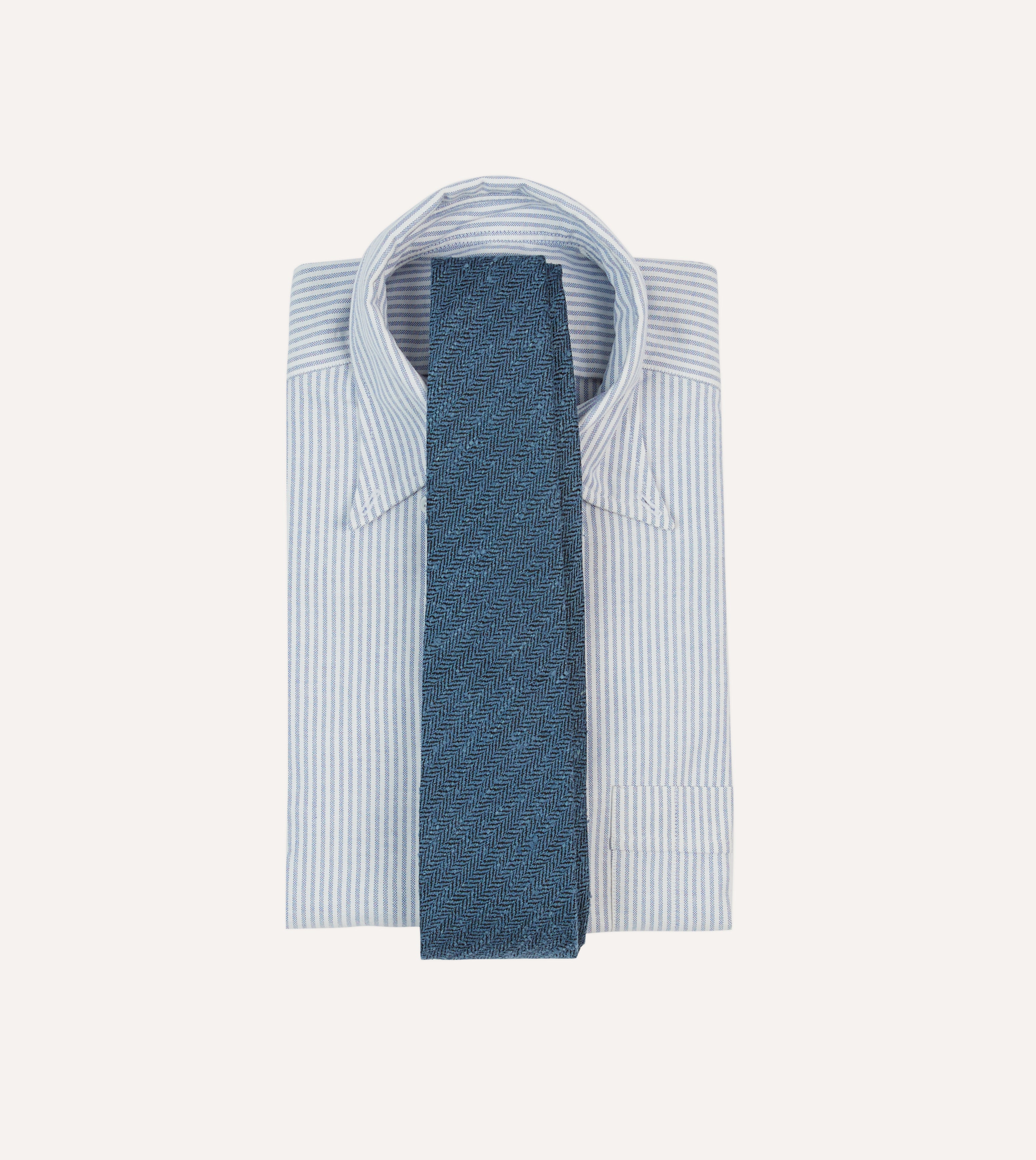 Tipping is the fabric sewn on the back of the tip and tail of a tie. Our trademark tipping is present in the form of a pure silk in Drake’s Navy.