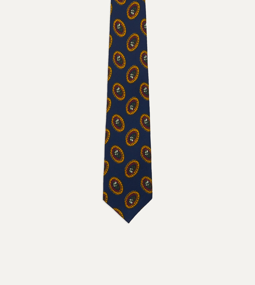 An ornate medallion design simply exudes elegance, particularly when printed on pure silk and hand rolled by our dedicated tiemakers in the heart of east London.