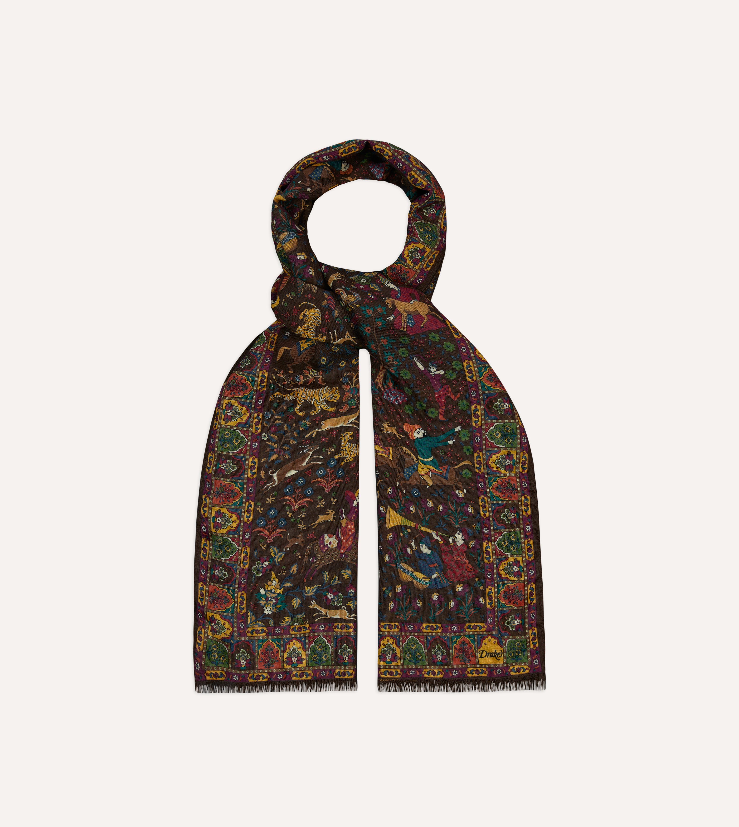 Brown Mughal Hunter Print Wool-Silk Scarf