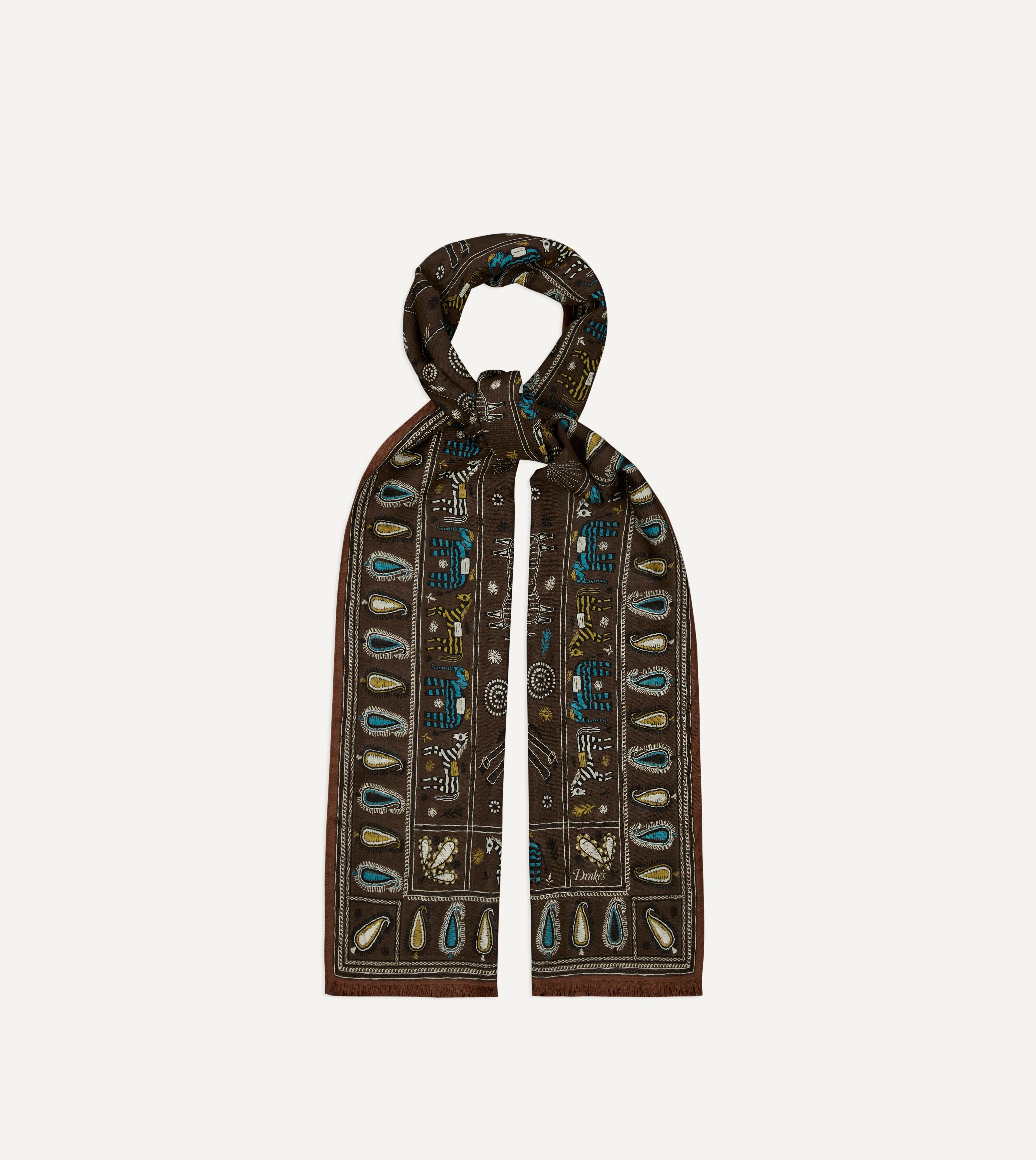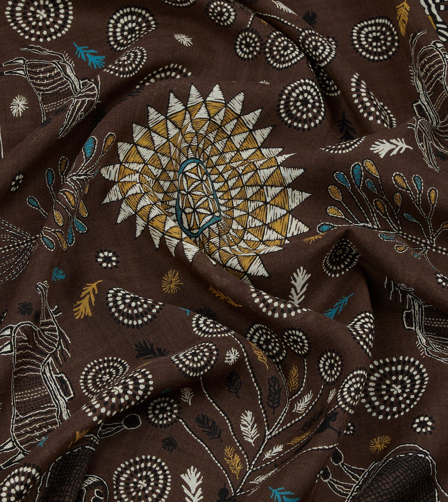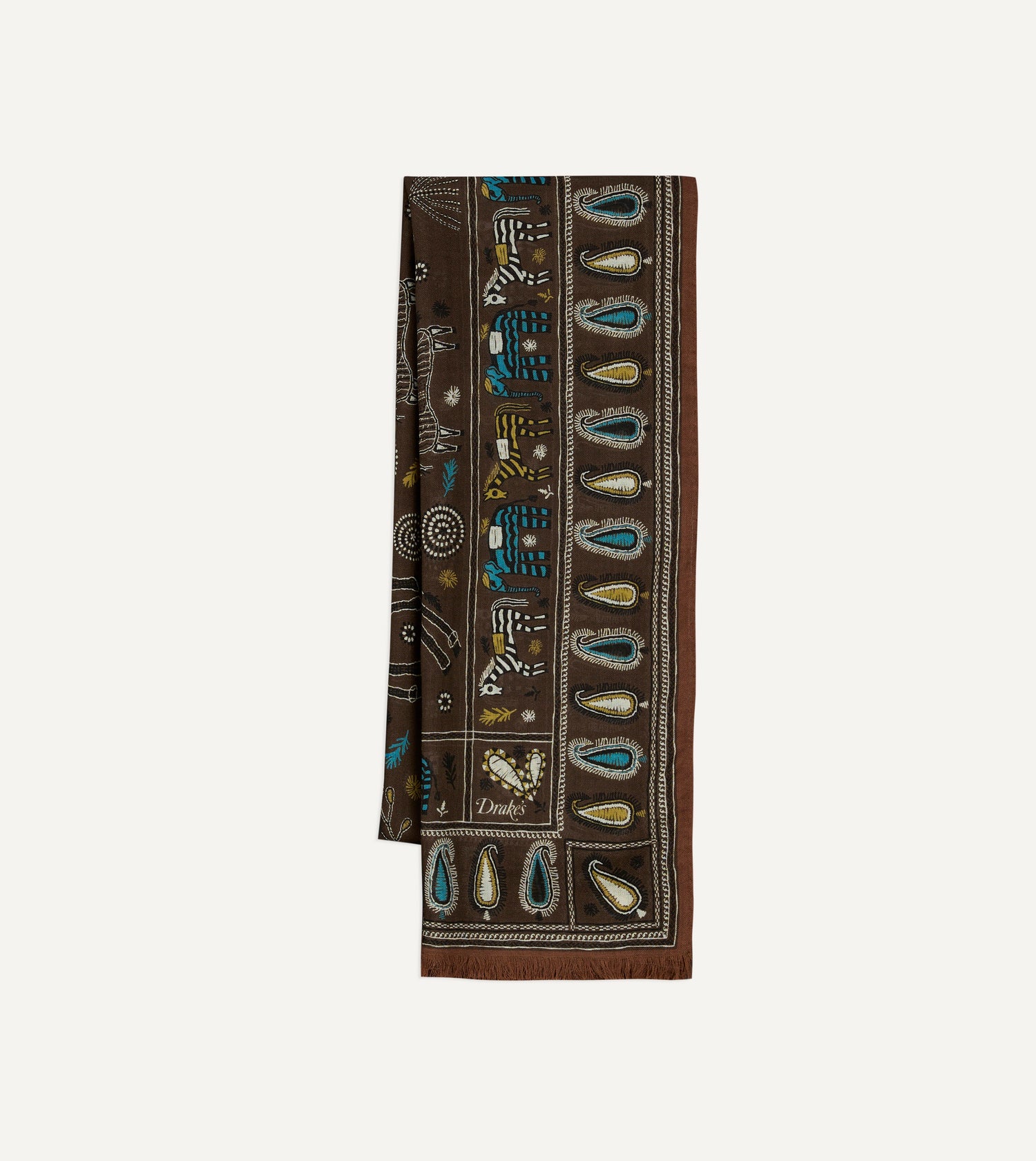 Brown Rustic Elephant Print Wool-Silk Scarf