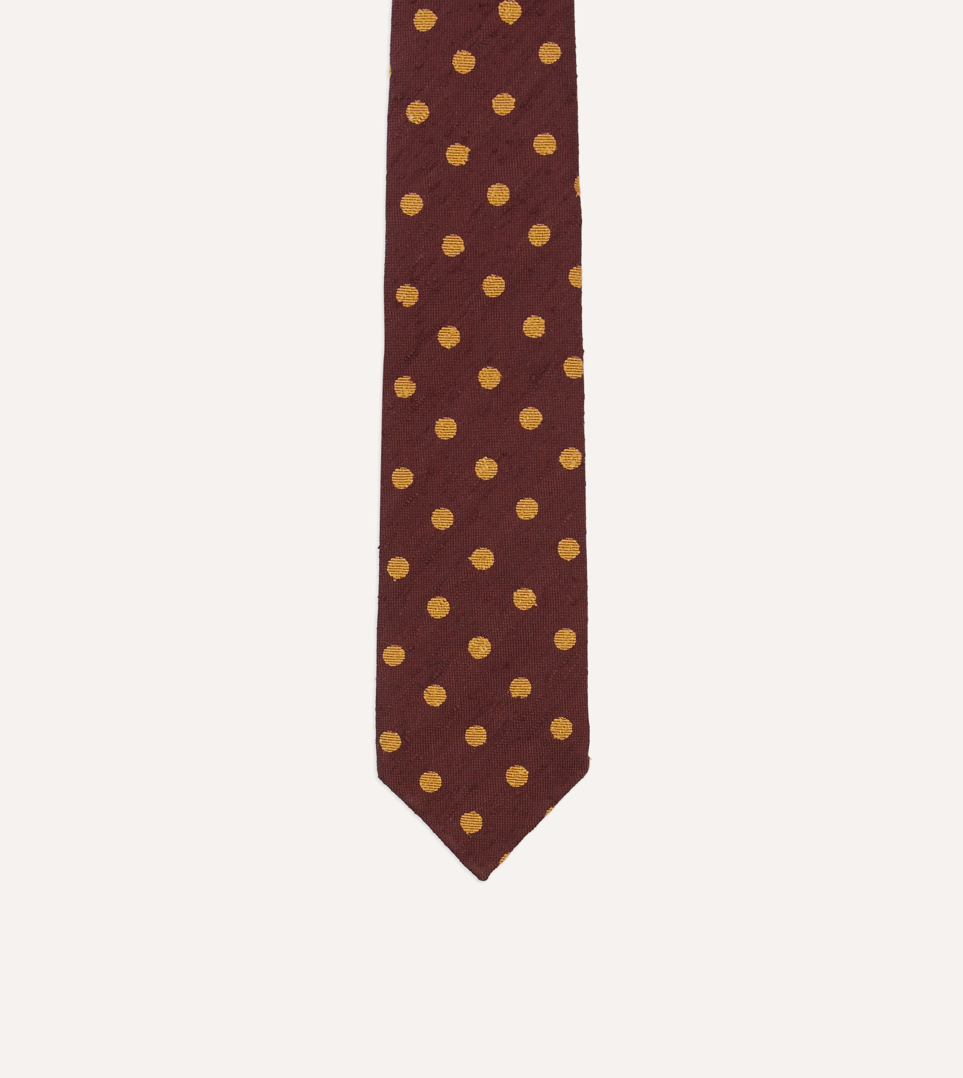 An elegant necktie, handmade in London from Shantung silk, known for its natural slub, featuring a spot pattern redolent of earlier periods of style, while retaining a distinctly modern feel.