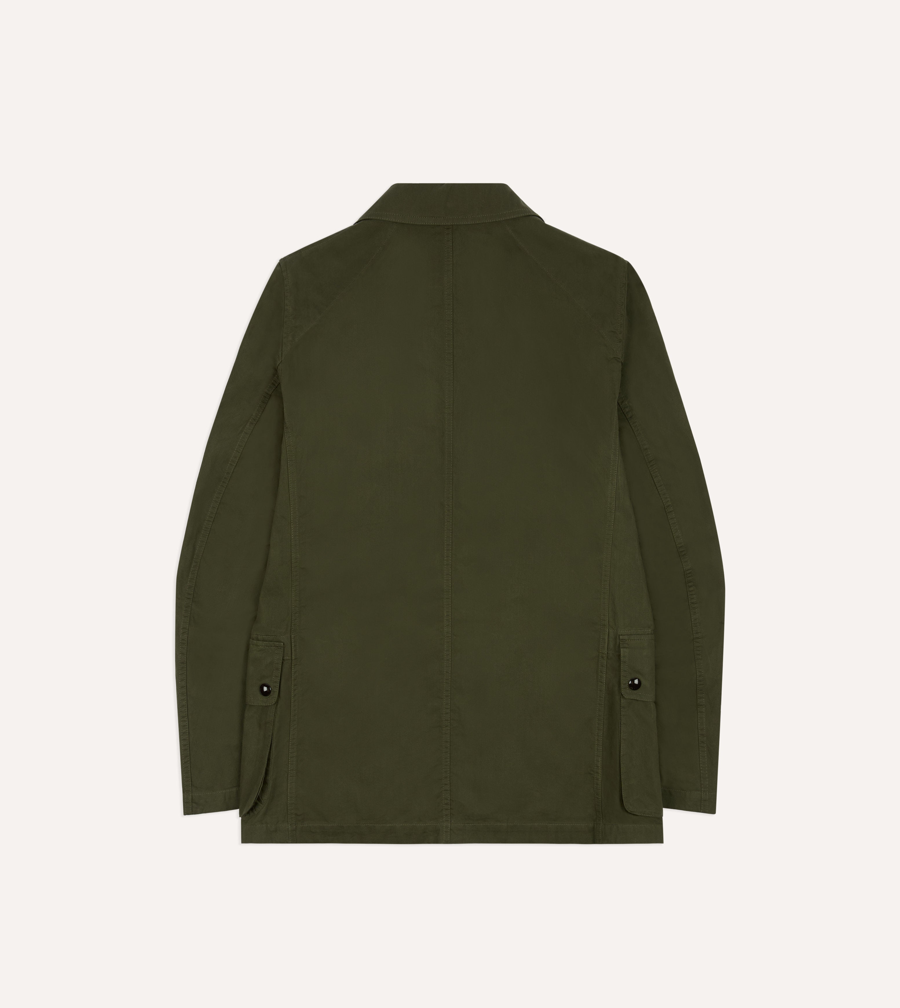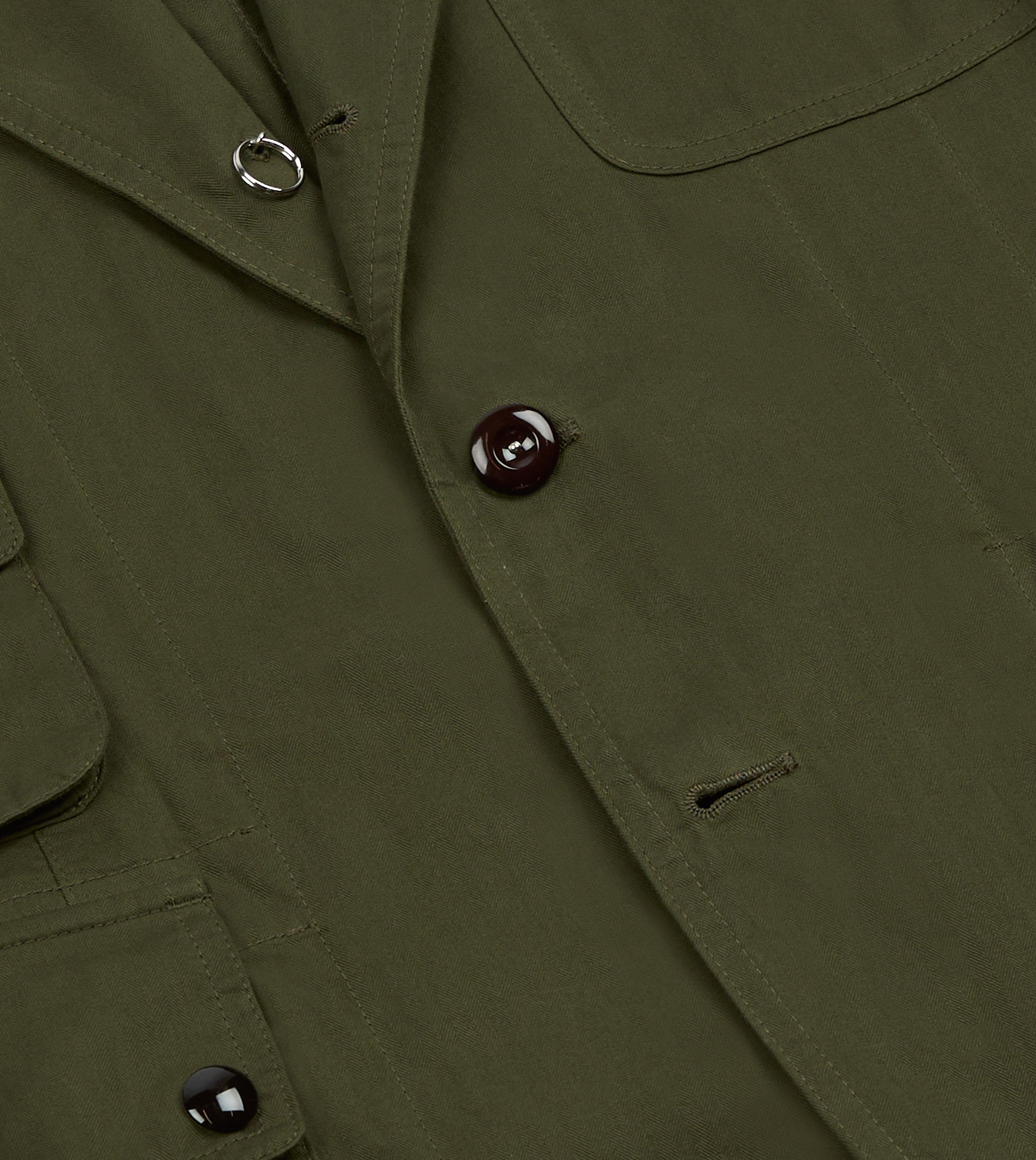 The shape stays true to the original; a boxy, relaxed, 3-roll-2 front, while the details lean a little more utilitarian: four outer snap tab pockets (two big bellowed numbers at the hips), a pair of internal ones for passports, phones or emergency oat bars, and pin buttons that can be removed via embroidered eyelets. A smart nod to classic workwear uniforms that carried removable buttons to allow for easy laundering.