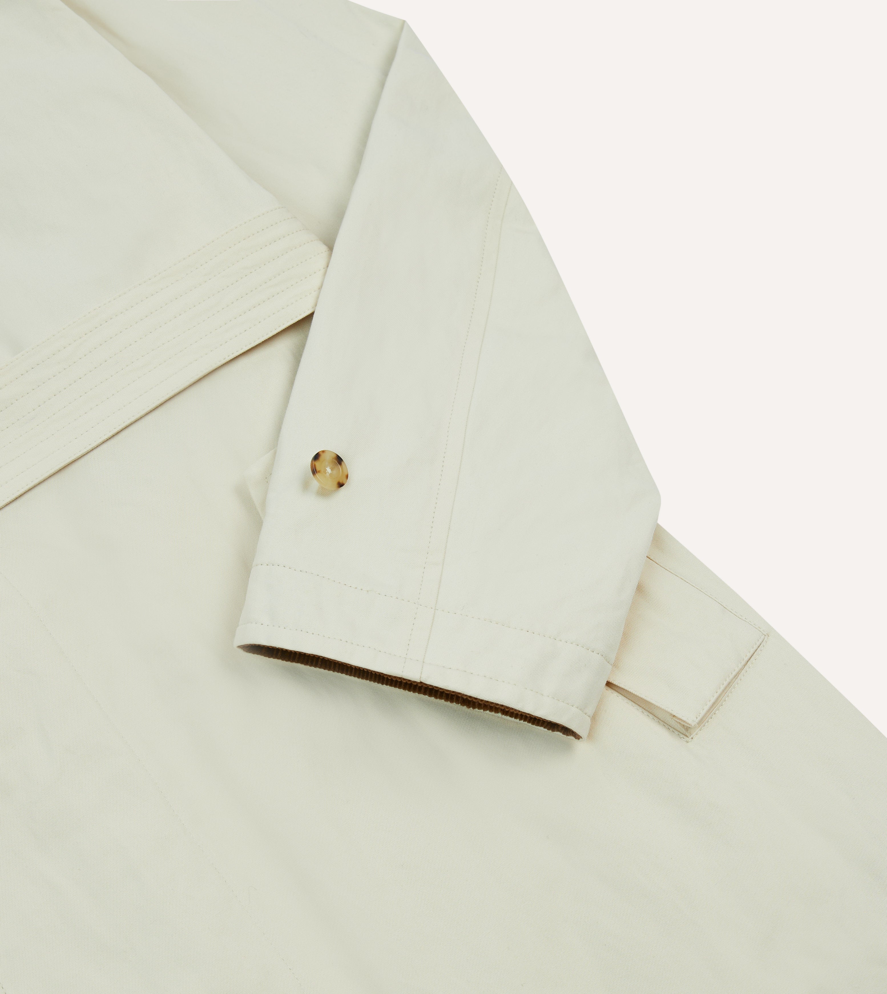 It's generous in length and body, unlike a lot of modern raincoats, and the belt at the waist can be cinched to create shape. It is cut from a densely woven 10oz cotton spun in Como with a touch of metal, which repels water and wind, making it ideal for a stroll through the country, or equally for a blustery day around town.