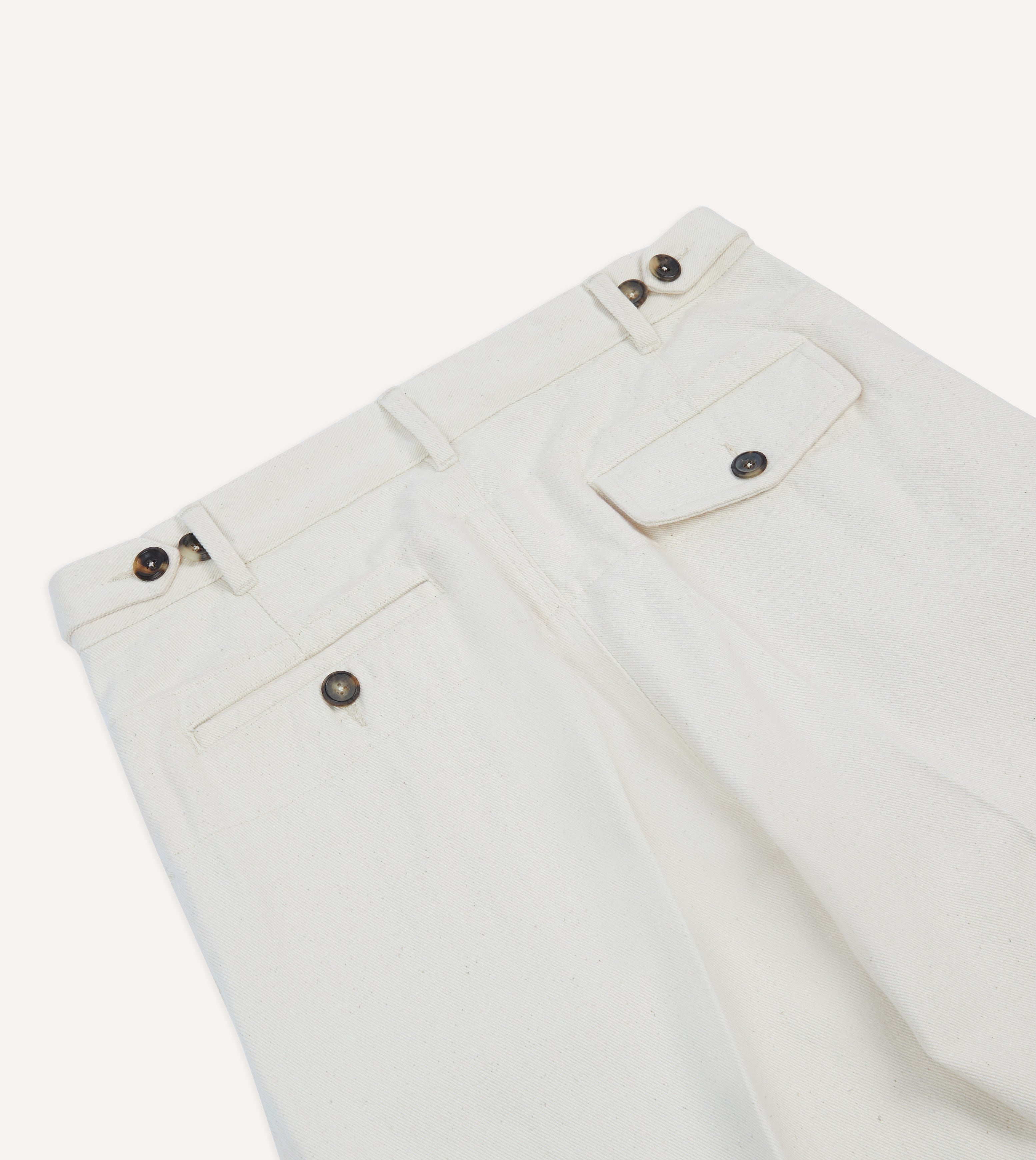 Side adjusters alongside belt loops and a concealed fob pocket keep up the utilitarian nature of these trousers, while a full leg and high rise for a more tailored waist that sits just above the hip creates a classic, mid-century shape.