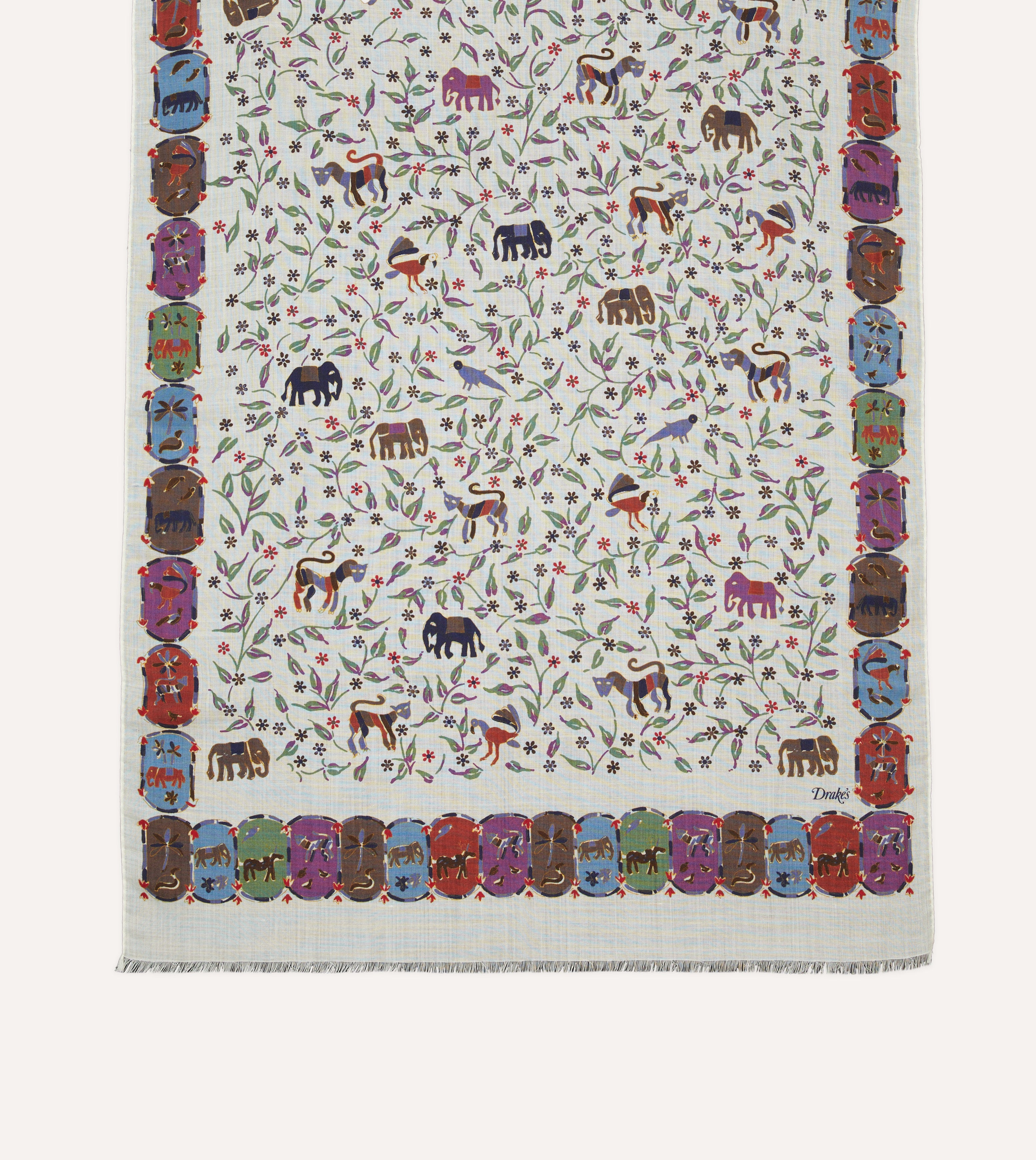 Ecru Elephants and Flowers Print Wool-Silk Scarf