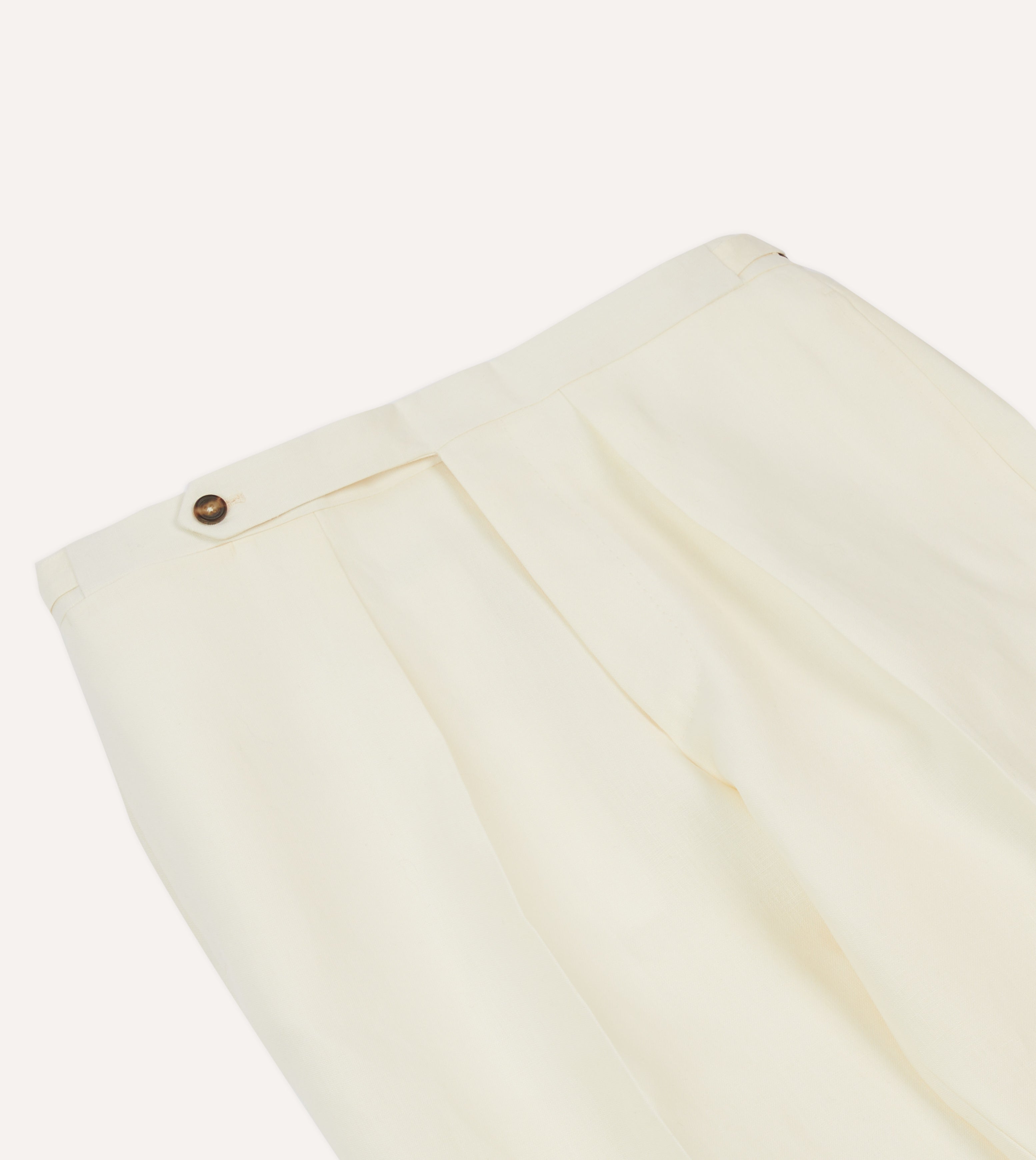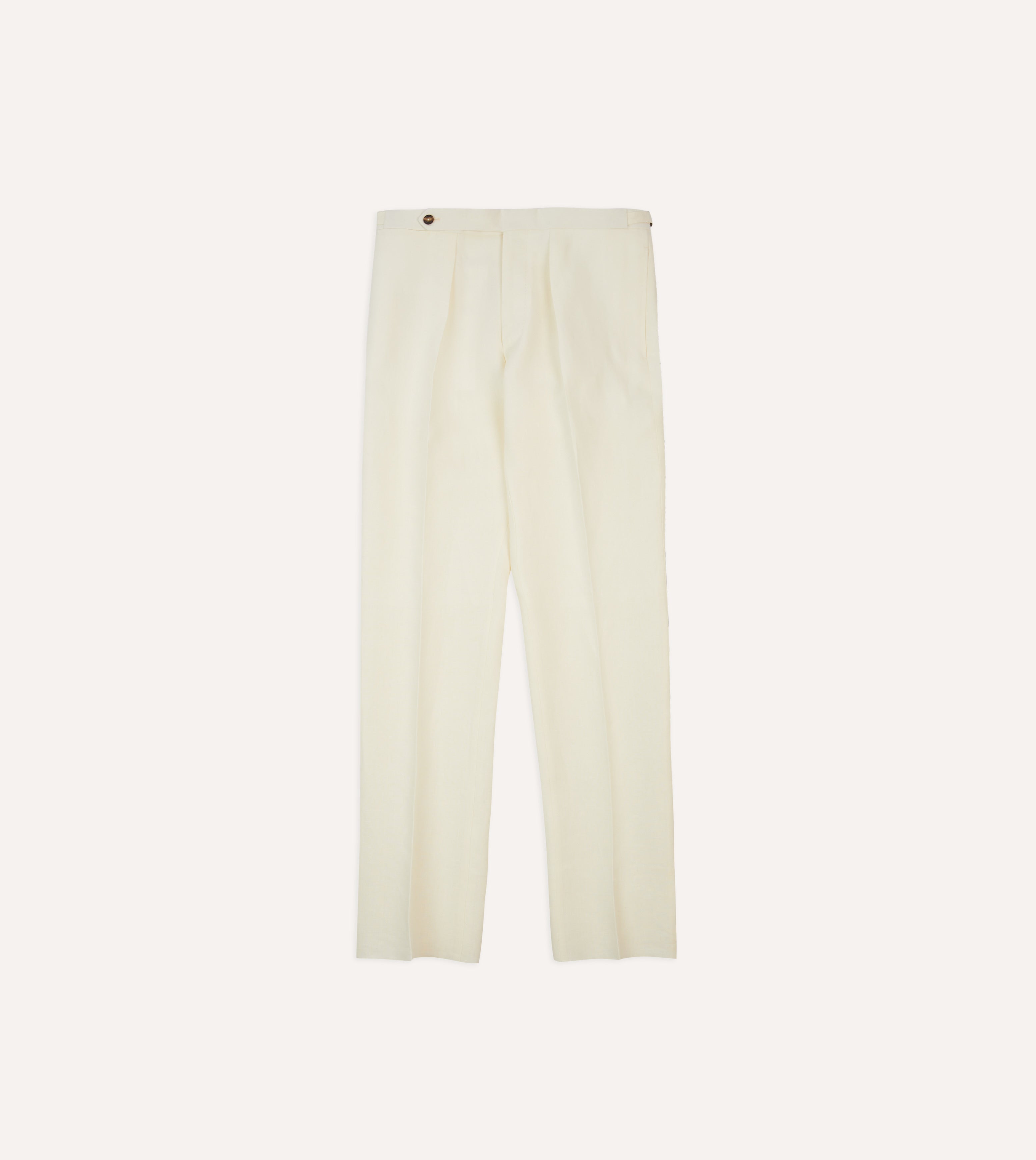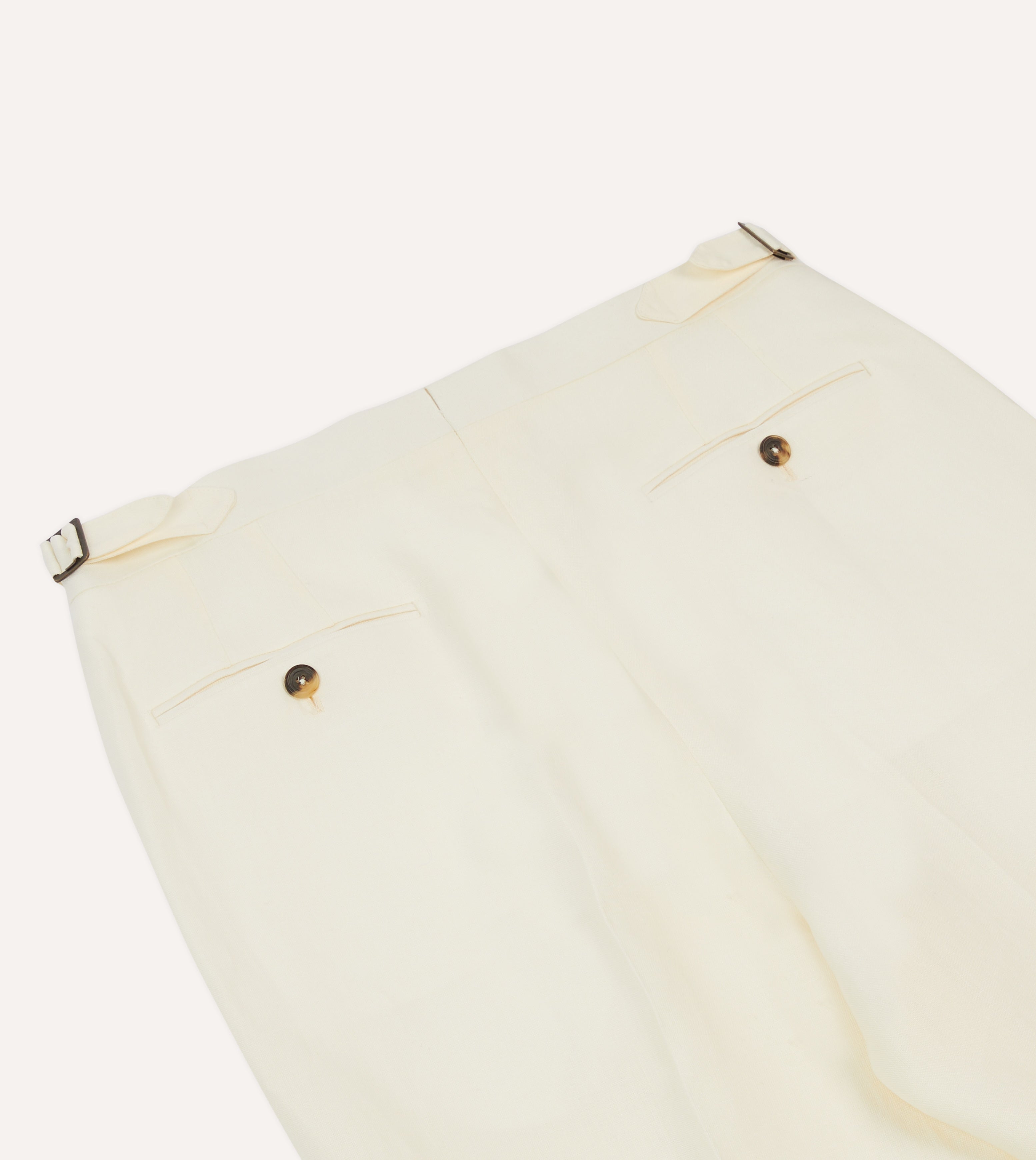 Crafted from a breezy Irish linen, the half-lined trousers feature understated details such as an extended tab front, French bearer buttoning with interior waistband curtaining, an after-dinner split to the rear, and side adjusters in lieu of belt loops.