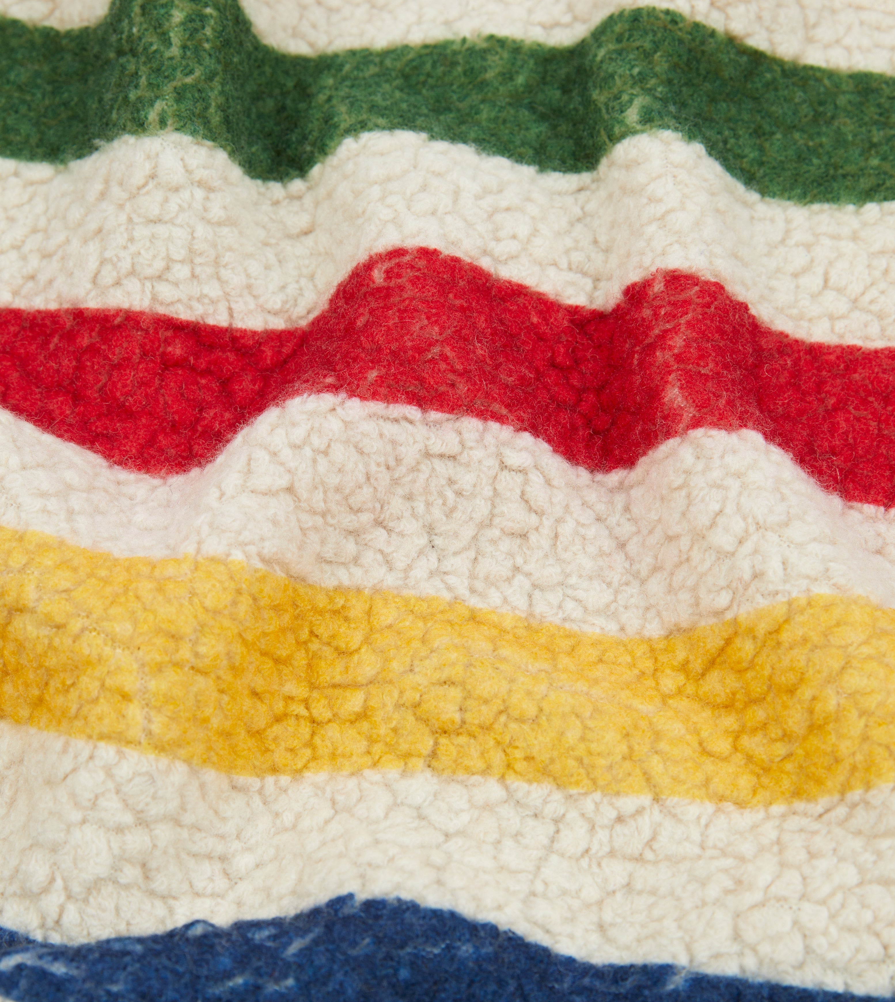 Cut from a dense Italian boucle fabric, this fleece jacket takes its cues from vintage outdoor gear and old Ivy League sideline style. The bands of colour that run across it recall traditional North American trade blankets: functional objects elevated by pattern, and now an enduring design language.