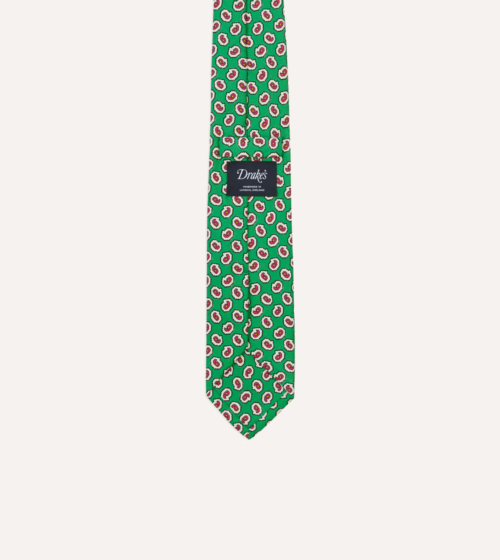 Green Small Paisley Leaf Print Silk Self Tipped Tie