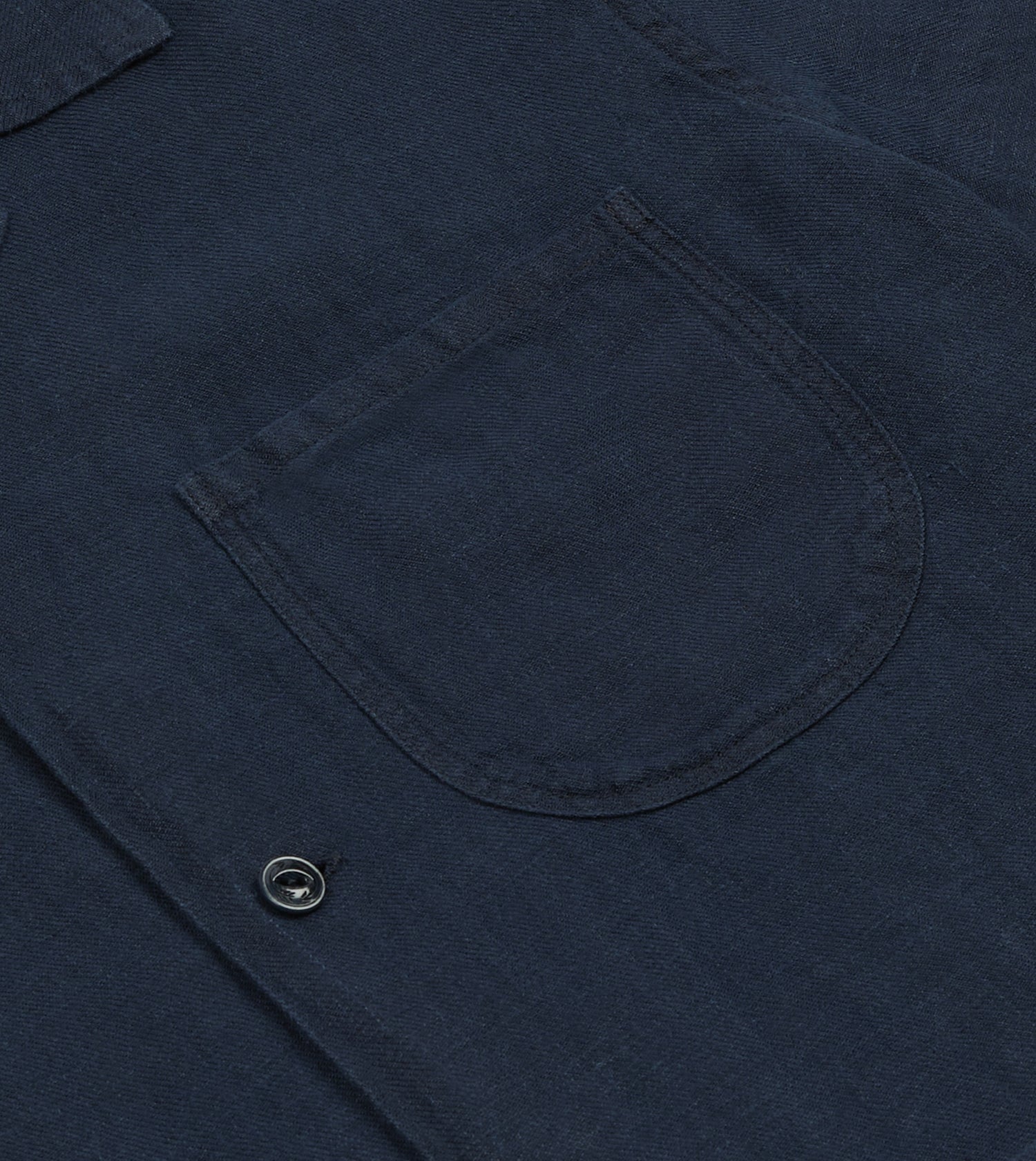 The safari shirt is constructed from a washed indigo linen for a soft, aged appearance, and features such pragmatic details as three patch pockets, an open collar and two internal pockets.