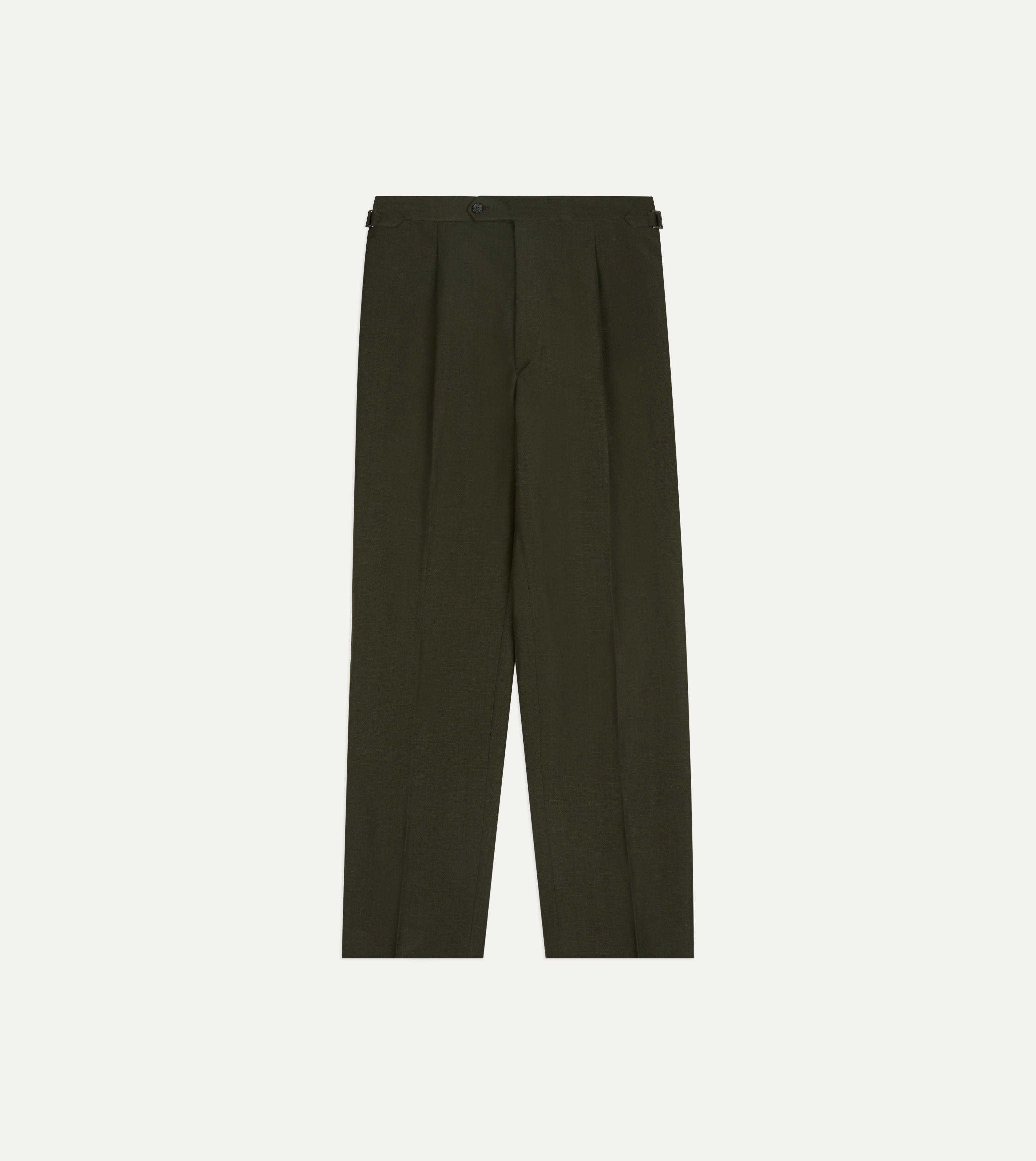Details are understated but considered: an extended tab front with French bearer, side adjusters in lieu of belt loops, and an after-dinner split at the rear. Half-lined to the knee, with curtaining at the waistband, they’re made to sit neatly, wear easily, and stand the test of time, whatever you pair them with.
