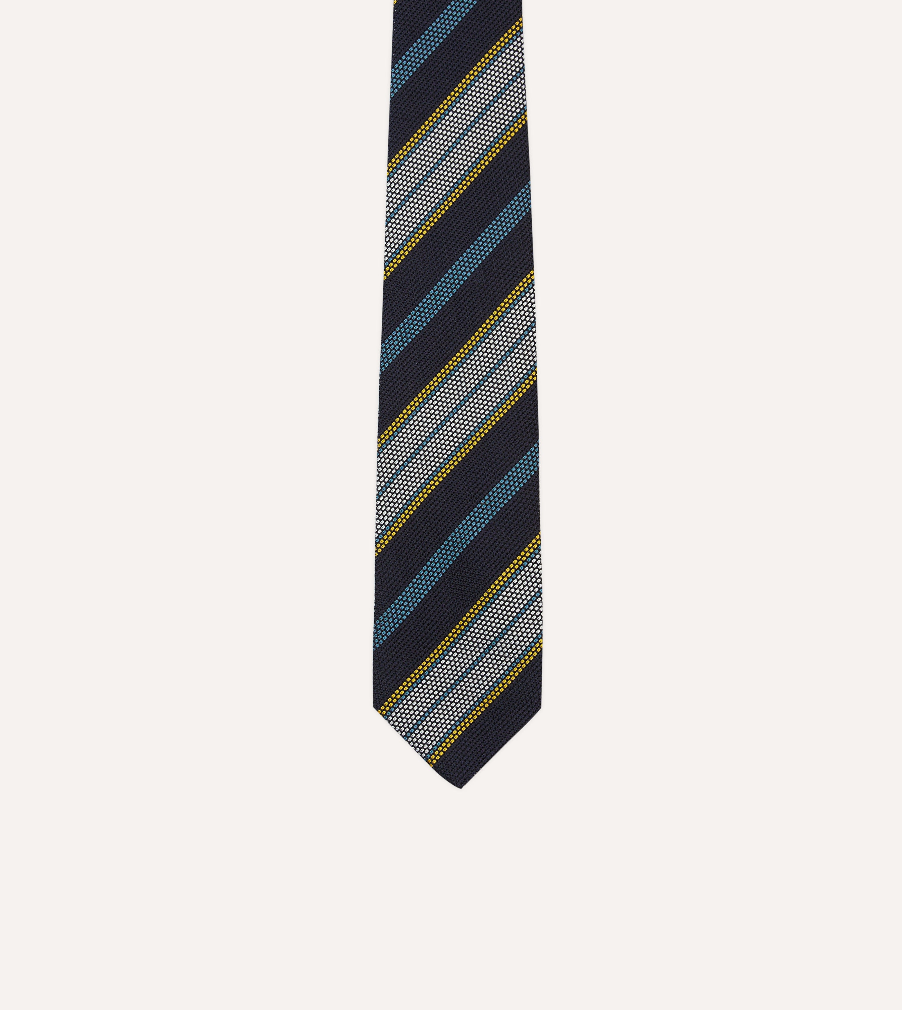 Navy, Blue, Yellow and White Multi Stripe Tipped Silk Grenadine Tie