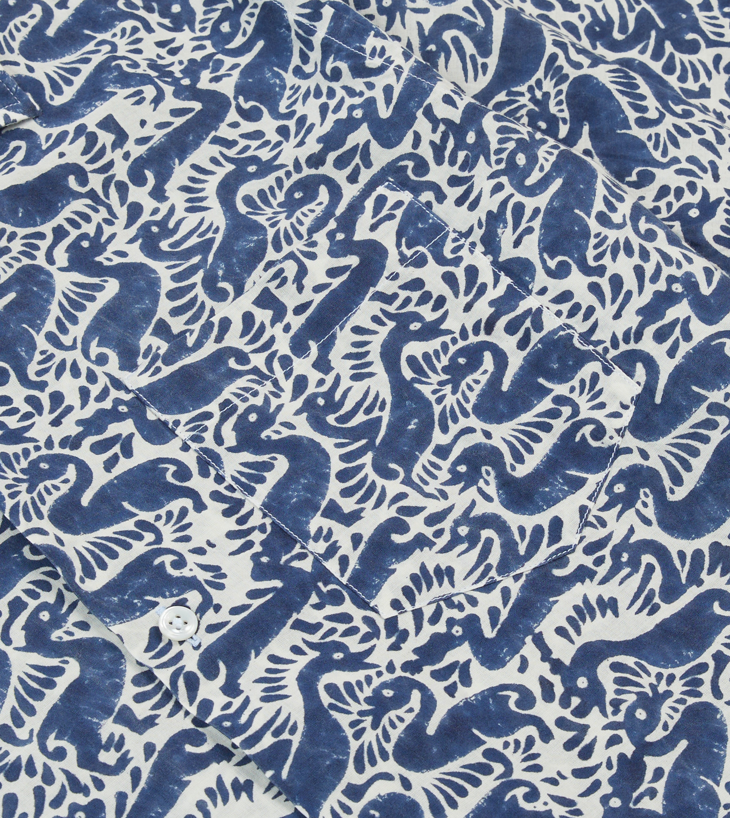 The Drake's take on this warm weather staple brings the story up-to-date; cut with a neat open collar, loose fit, plain front and straight hemline, all constructed from a soft, breezy cotton fabric, authentically block-printed by hand. It is, quite simply, the quintessential high summer shirt.