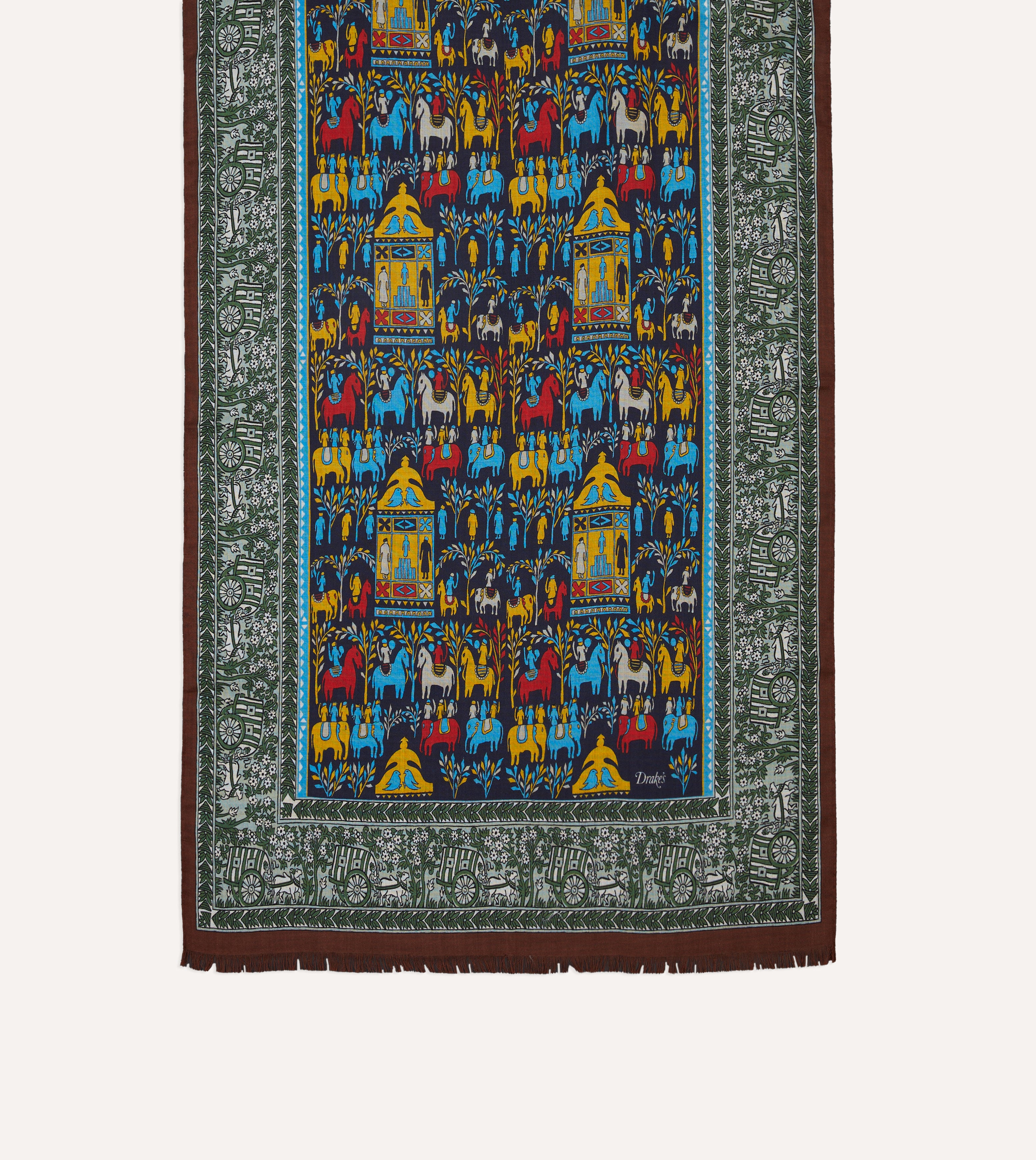 Taken from our extensive design archive, this elephant village motif has been vividly applied to a blend of pure wool and silk, perfect for introducing a subtle and sophisticated dash of pattern to one's ensemble.