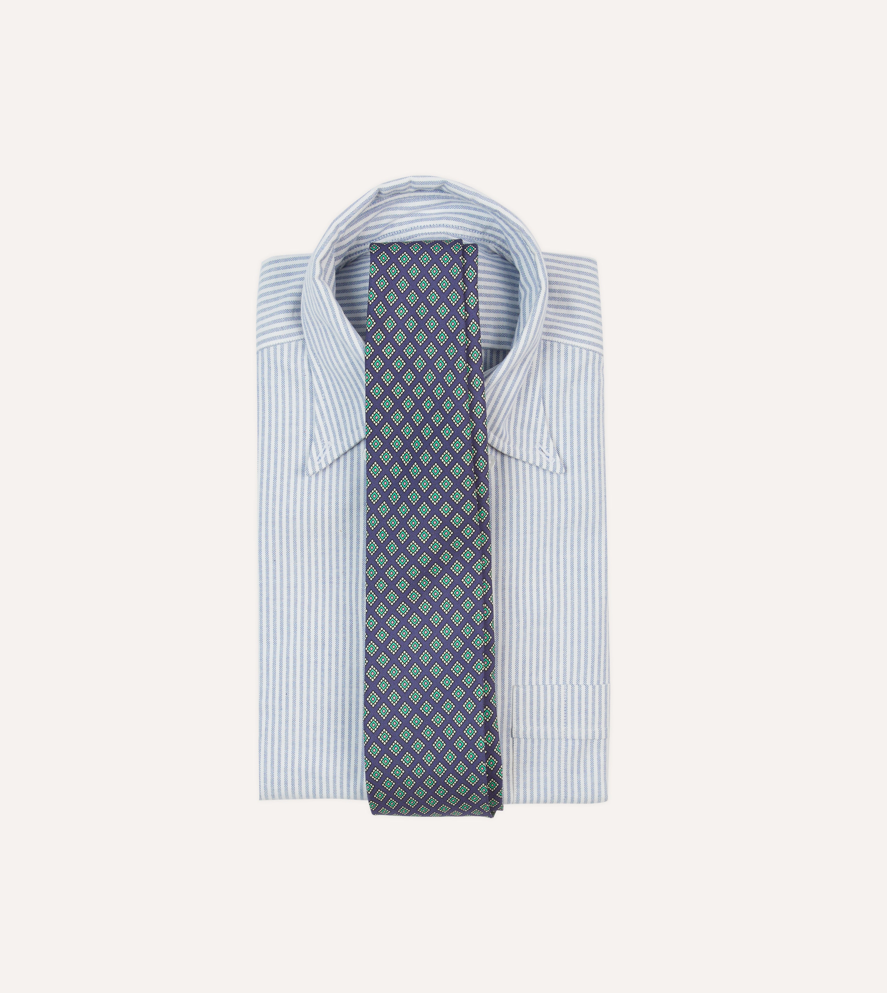 An ornate square motif simply exudes elegance, particularly when printed on pure silk and hand rolled by our dedicated tiemakers in the heart of east London.