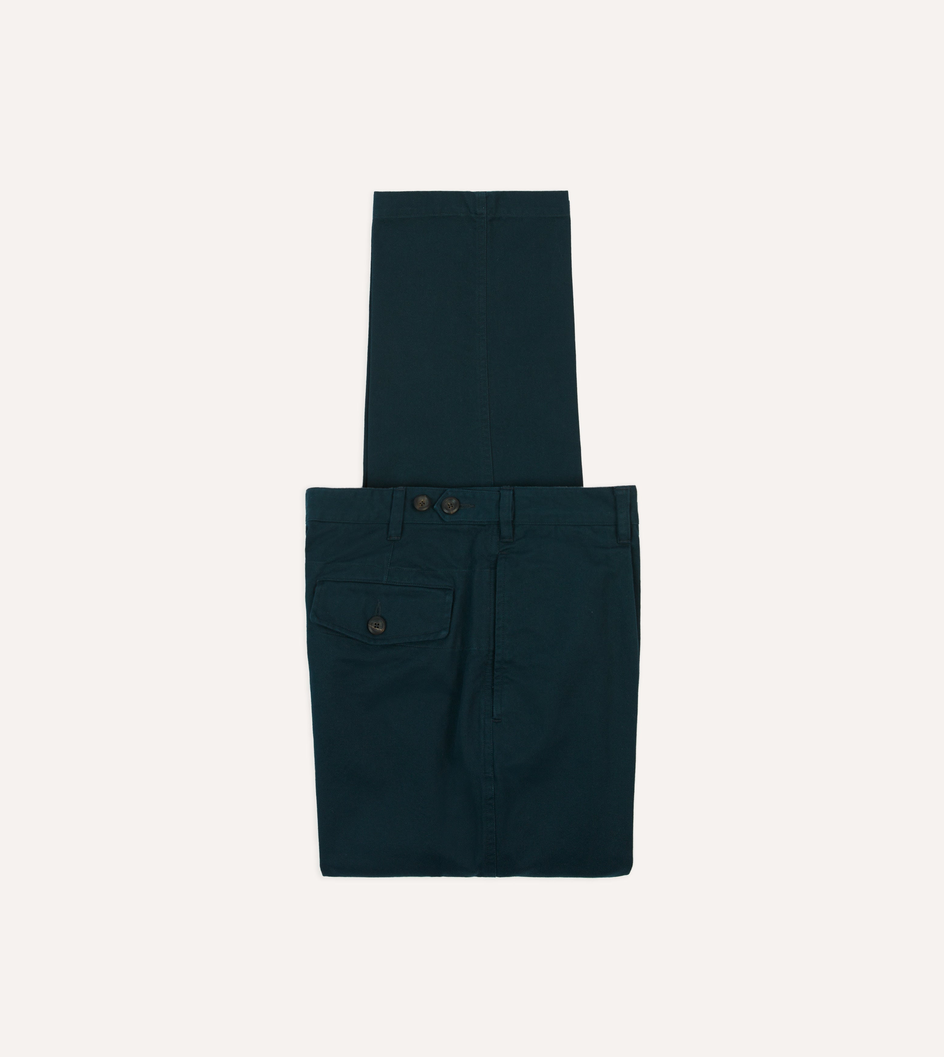 Side adjusters alongside belt loops and a concealed fob pocket keep up the utilitarian nature of these trousers, while a full leg and high rise for a more tailored waist that sits just above the hip creates a classic, mid-century shape.