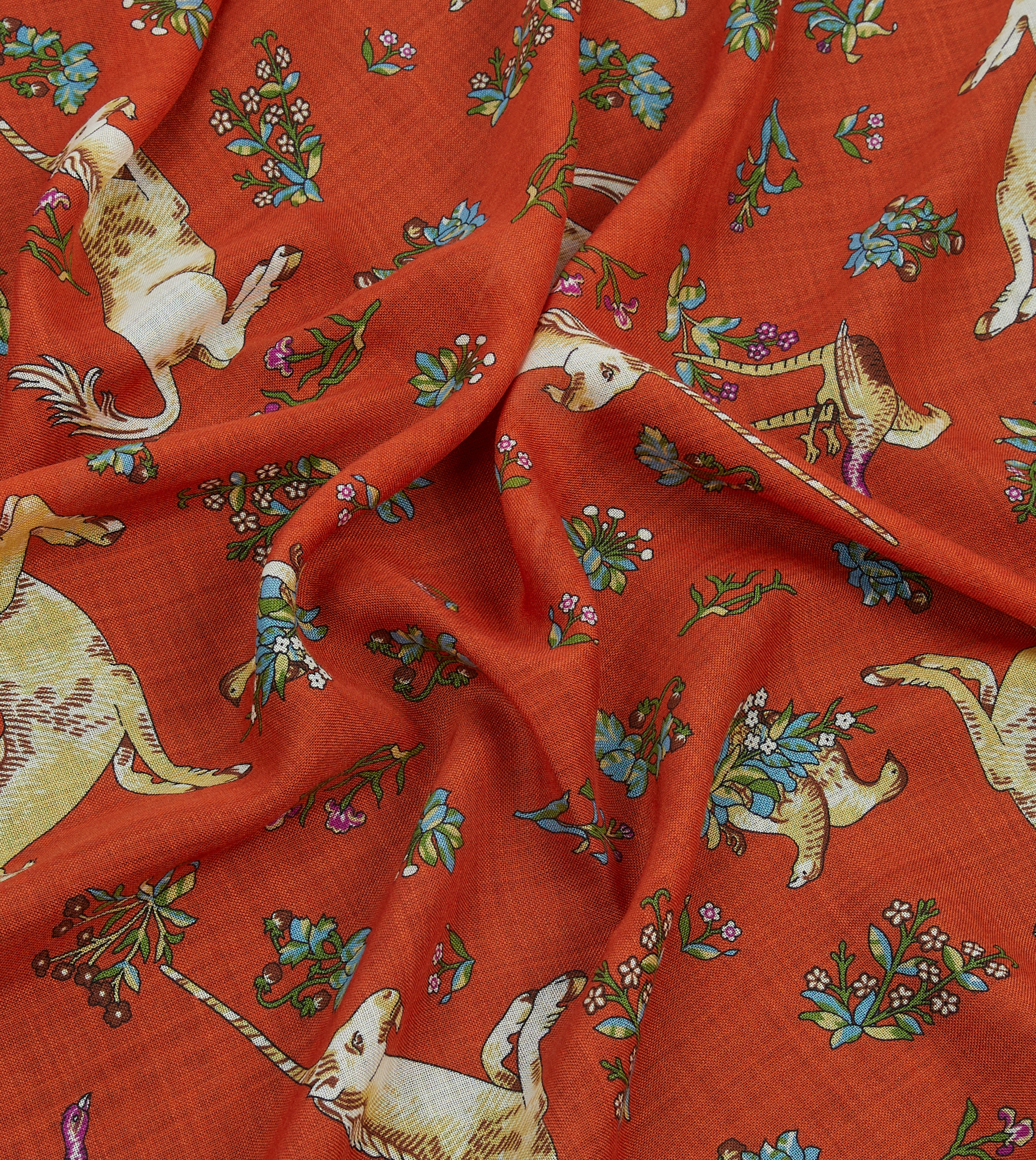 Taken from our extensive design archive, this unicorn motif has been vividly applied to a blend of pure wool and silk for an elegant and airy addition to your arsenal.