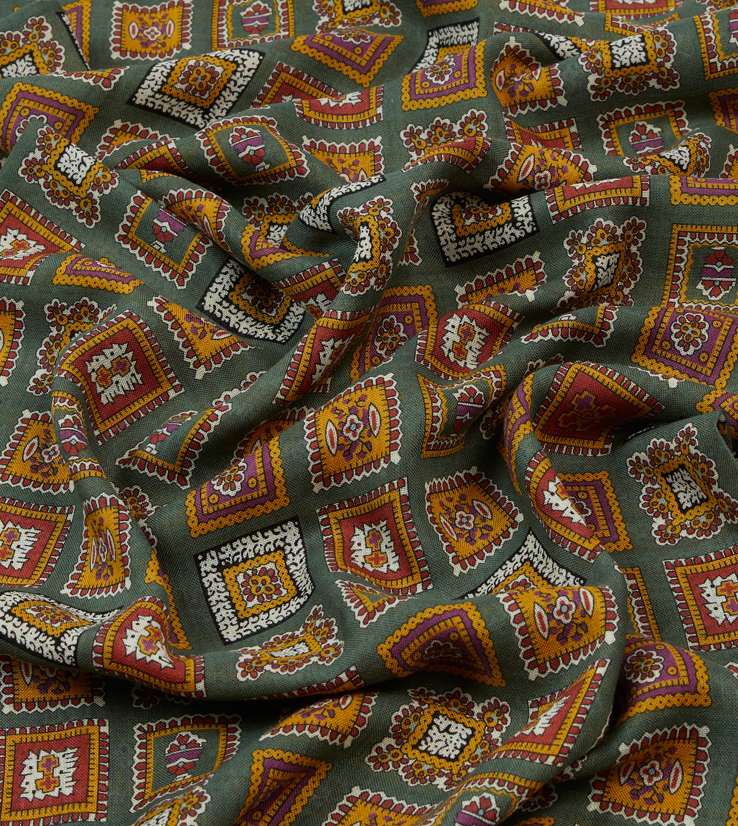 Taken from our extensive design archive, this medallion motif has been vividly applied to a blend of pure wool and silk for an elegant and airy addition to your arsenal.