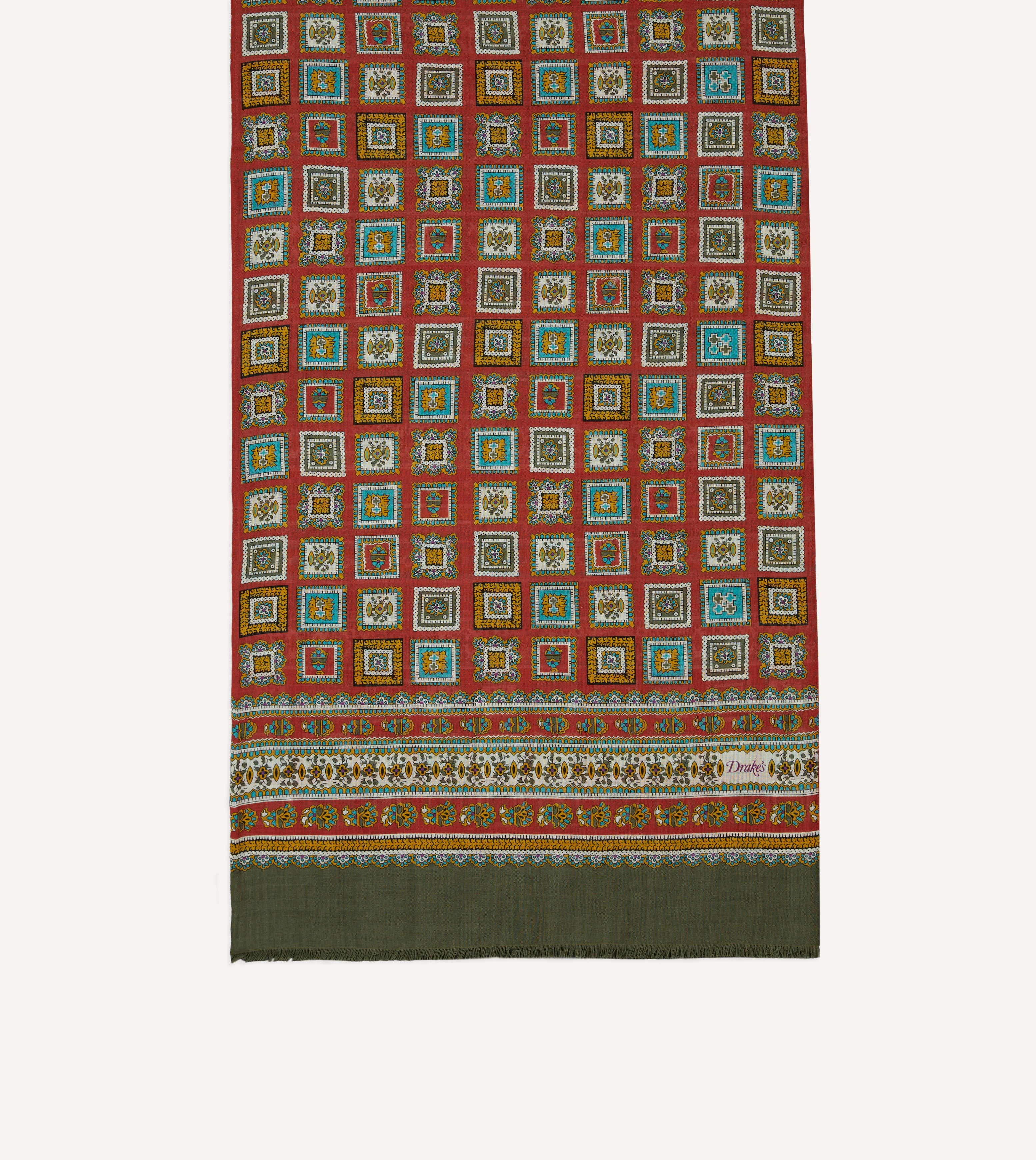 Red and Green Medallion Print Tubular Wool Silk Scarf