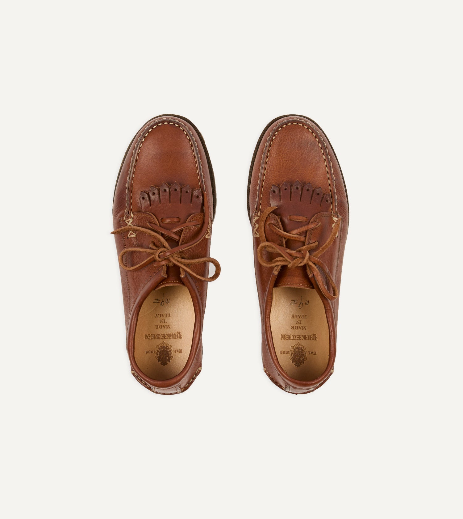 Finished with a removable leather ‘kiltie’, pinked details, metal eyelets, and strong cowhide laces, the upper rests on a robust camp sole made of rubber blended with cork, in homage to 1960s work boots.